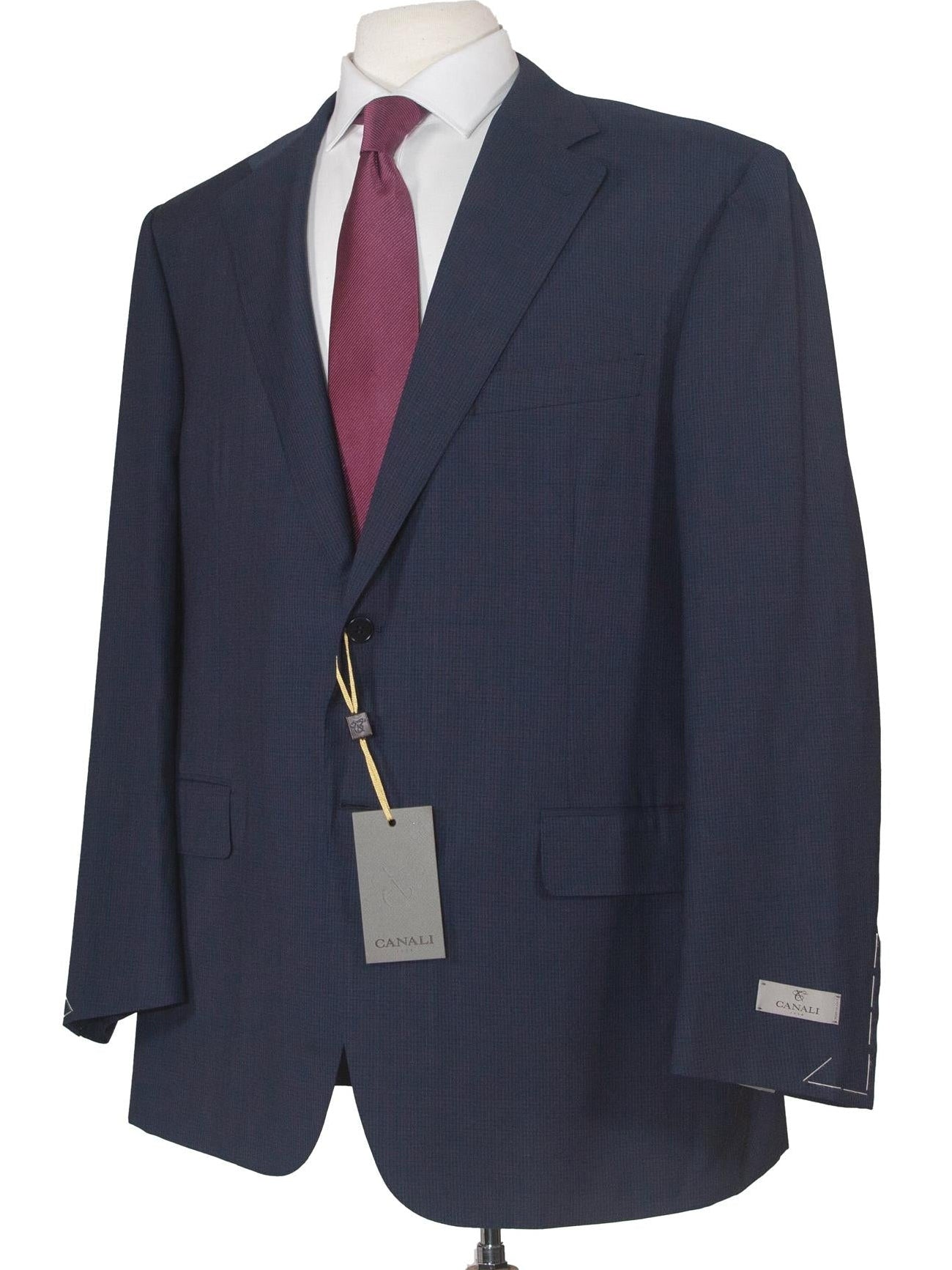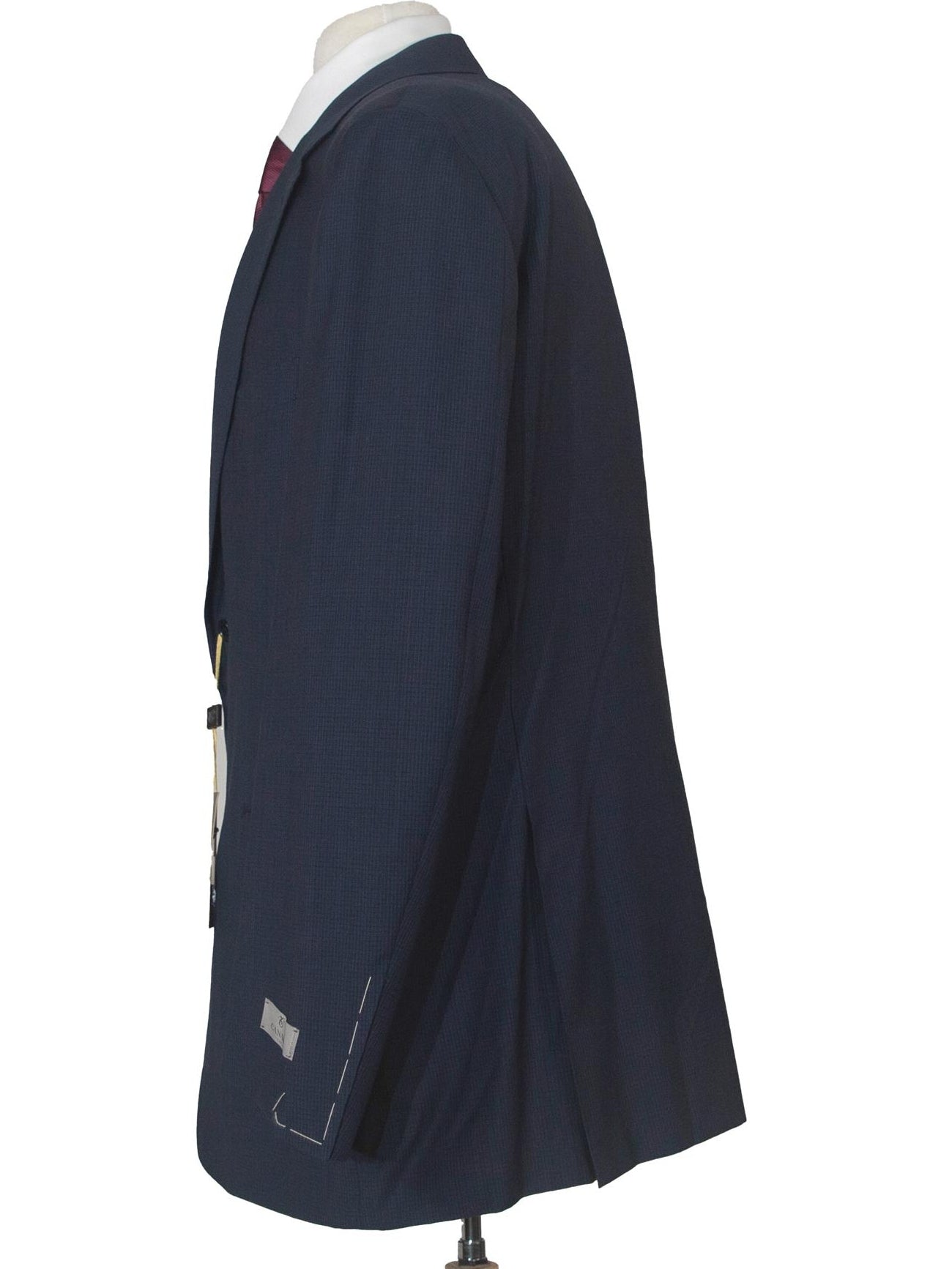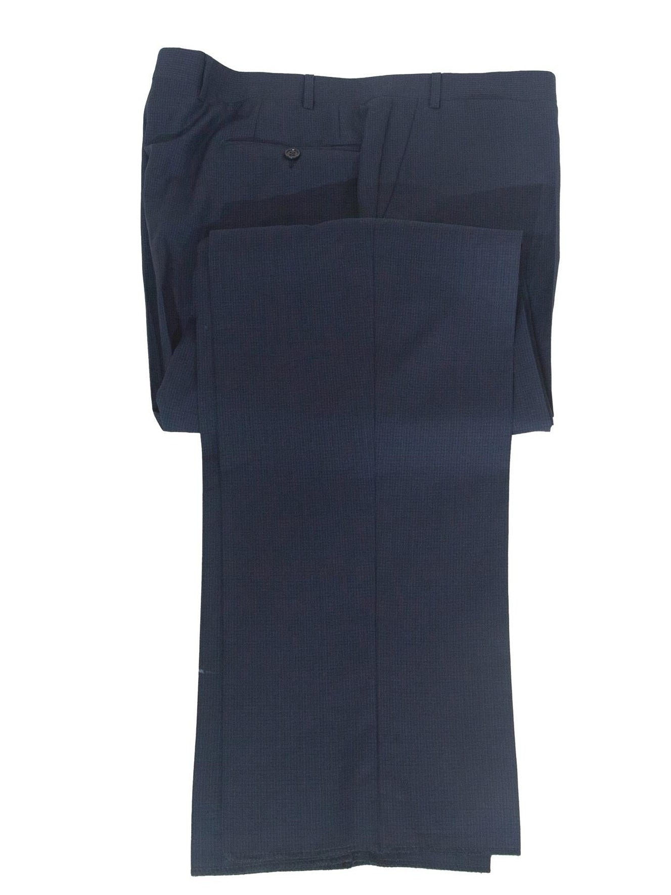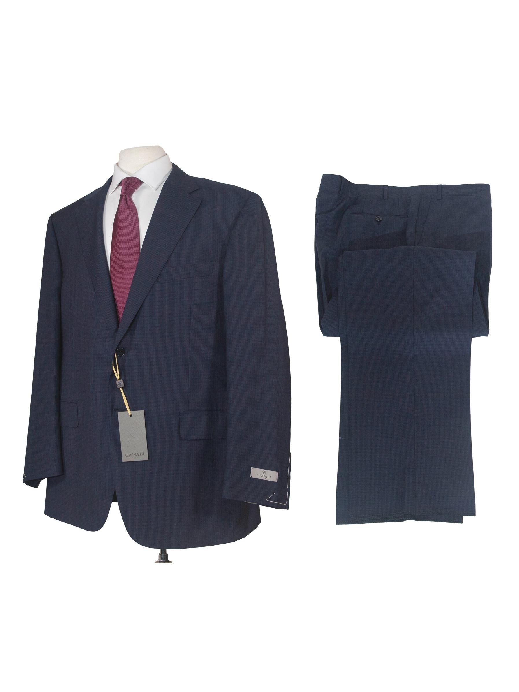 This elegant modern fit navy check 100% wool suit features full-canvassed construction and fine tailoring. It is the perfect suit for special occasions or business wear. With its impeccable Italian tailoring, this suit is the epitome of effortless style. Immerse yourself in luxury, knowing that every stitch has been carefully designed, every seam meticulously tailored.
