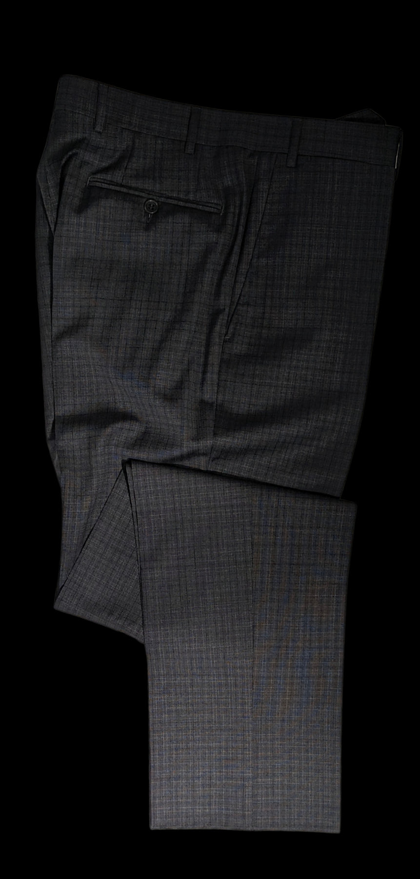 - Flat front pants, unhemmed.