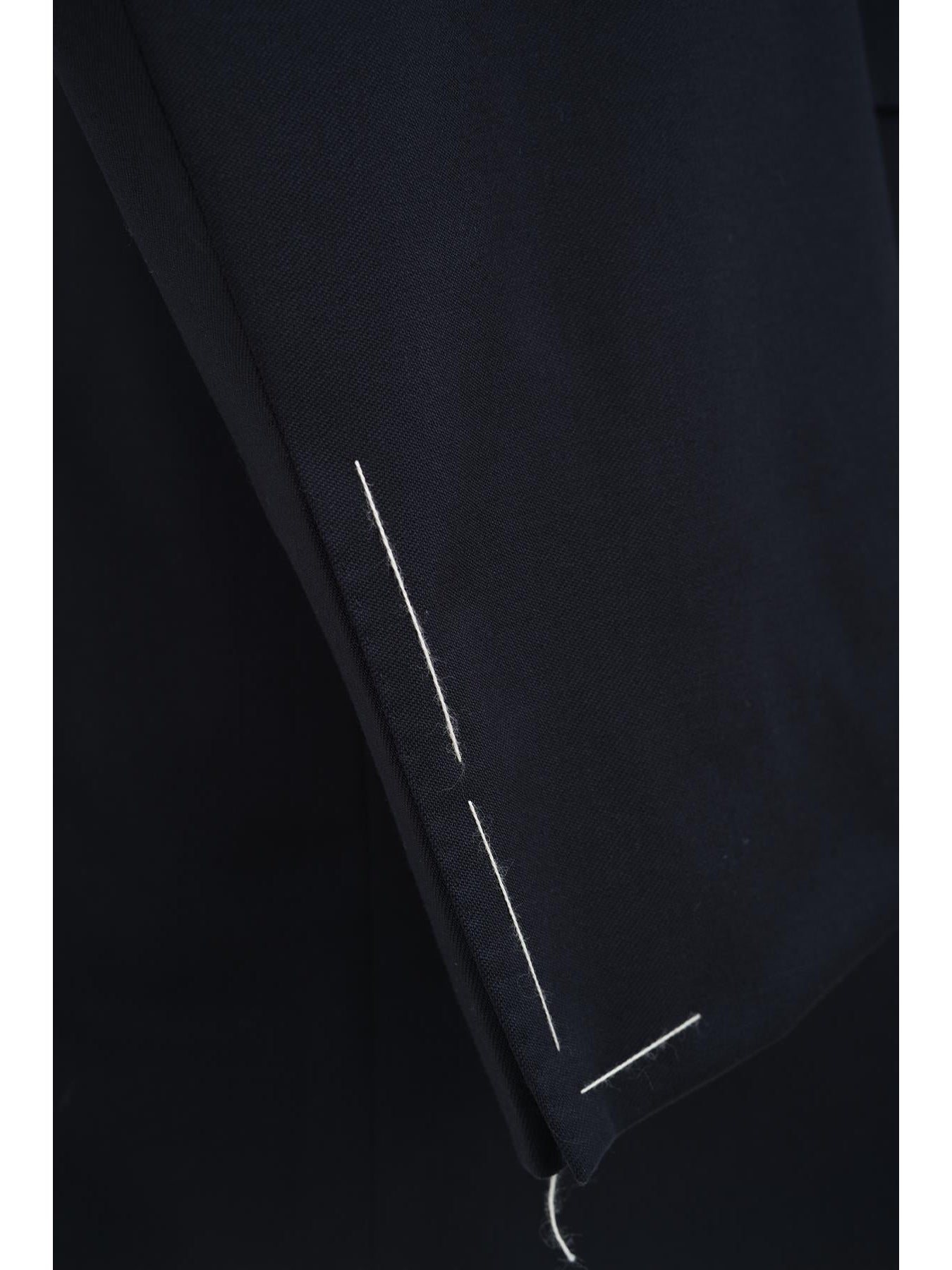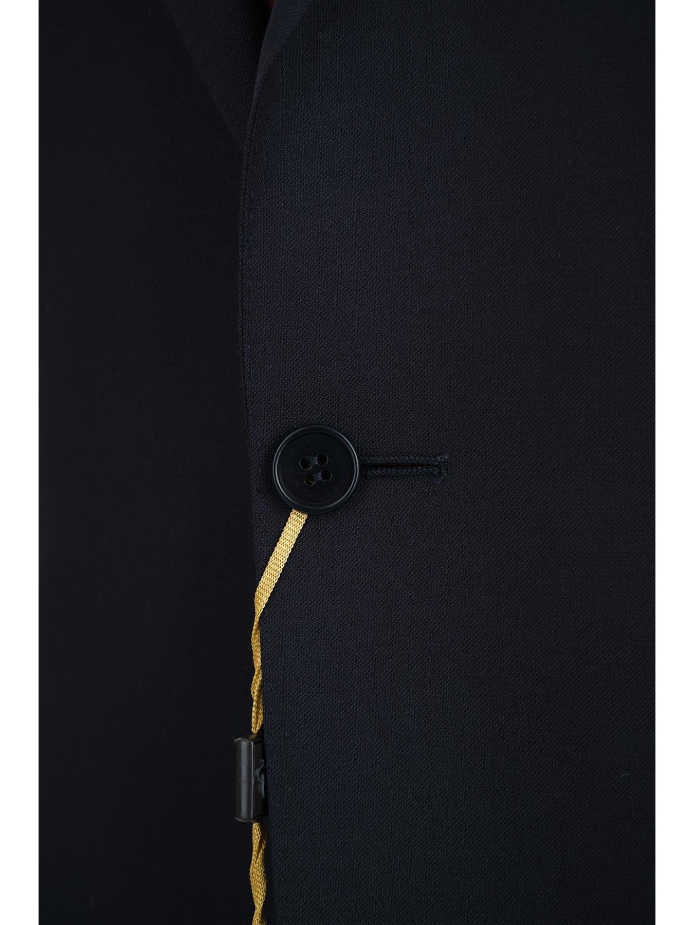 This elegant modern fit navy blue 100% wool suit features full-canvassed construction and fine tailoring. It is the perfect suit for special occasions or business wear. With its impeccable Italian tailoring, this suit is the epitome of effortless style. Immerse yourself in luxury, knowing that every stitch has been carefully designed, every seam meticulously tailored.