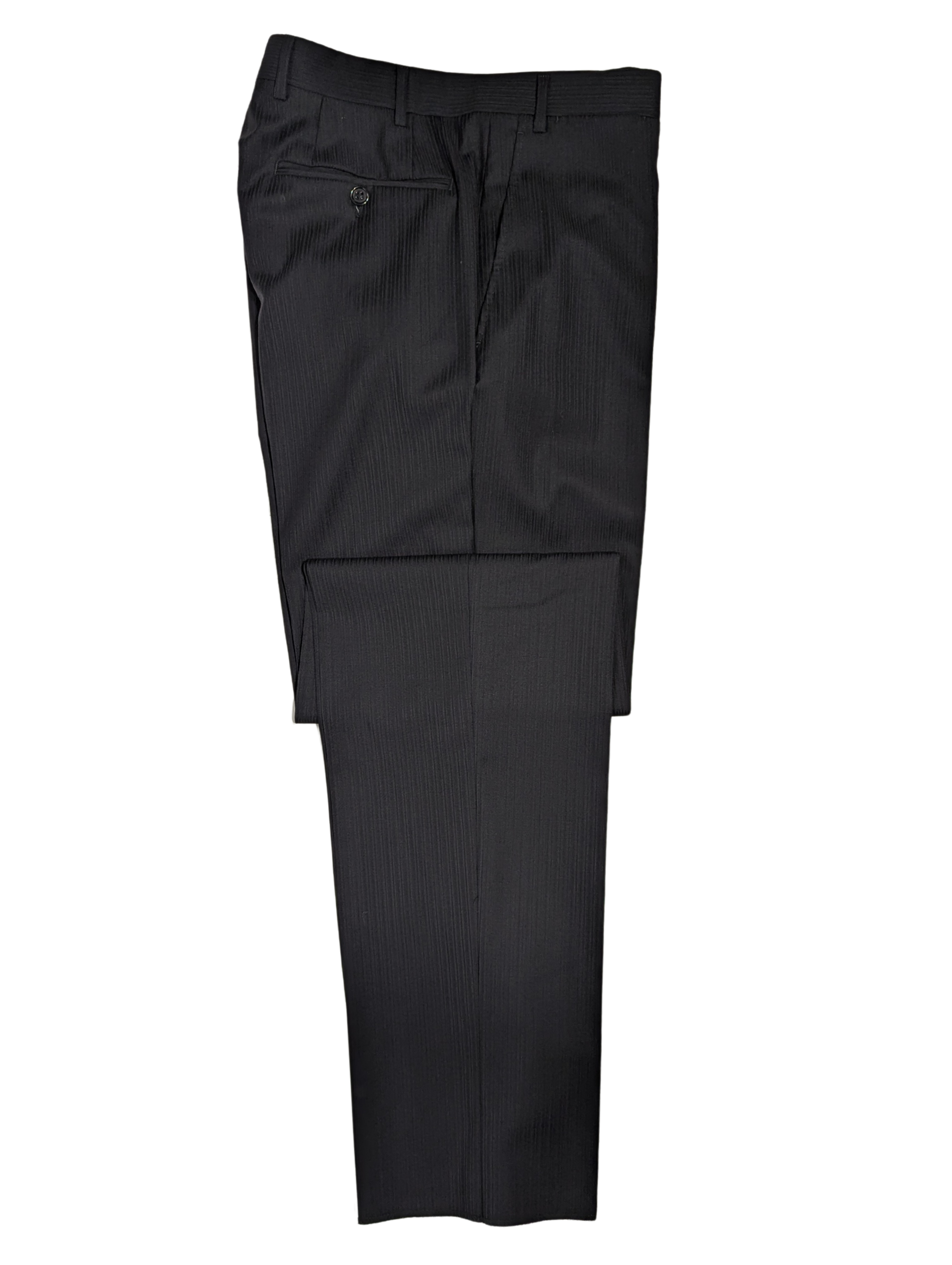 This Canali black tonal stripe suit offers sleek sophistication with subtle texture and depth. Expertly crafted in Italy from fine wool, the suit features a black base accented with understated tonal stripes, offering a refined and modern twist on the classic pinstripe. The jacket is fully canvassed for superior shape and drape, featuring a two-button front, notch lapels, full lining, and dual side vents for comfort and movement. Flat-front trousers complete the clean, tailored silhouette. Ideal for formal events, business attire, or elegant evening wear, this suit captures Canali’s commitment to timeless Italian craftsmanship.