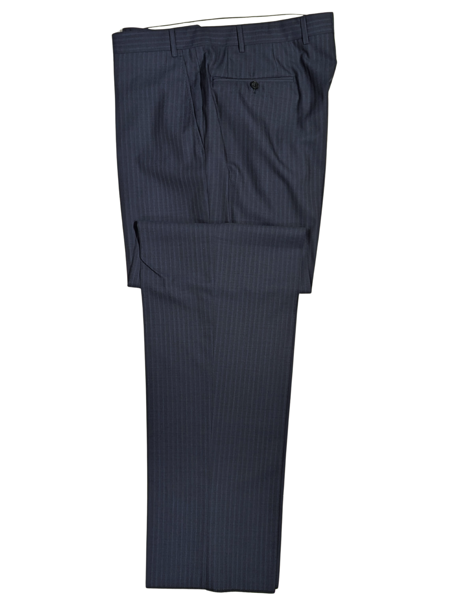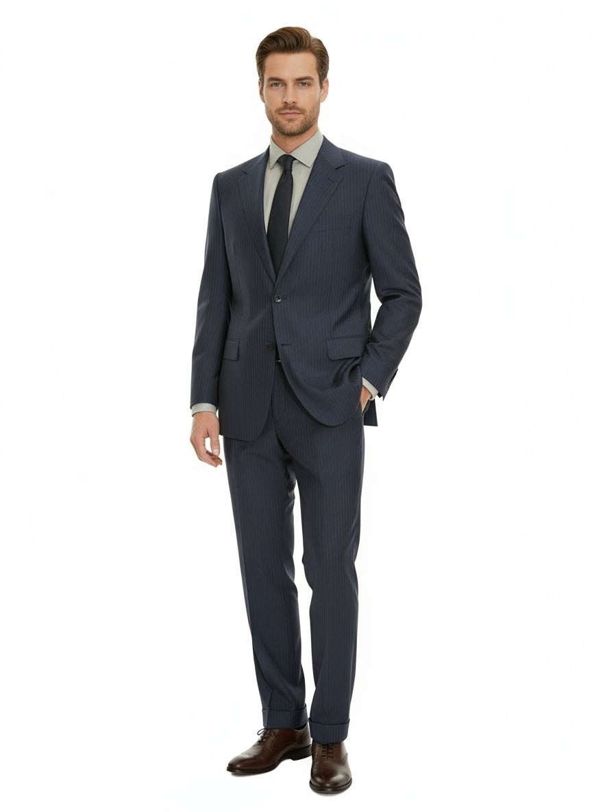 This Canali blue tonal stripe suit offers an elegant balance of subtle texture and timeless sophistication. Crafted in Italy from premium wool, the fabric features a finely woven tonal stripe pattern, creating a refined yet understated visual appeal. The suit is fully-canvassed for a structured and lasting fit, complete with a two-button front, notch lapels, full lining, and dual side vents for comfort and flexibility. Paired with flat-front trousers, this suit provides a sleek, modern silhouette suitable for business, formal events, or any occasion requiring high-quality tailoring. A versatile addition to any wardrobe, embodying Canali's commitment to luxury and craftsmanship.