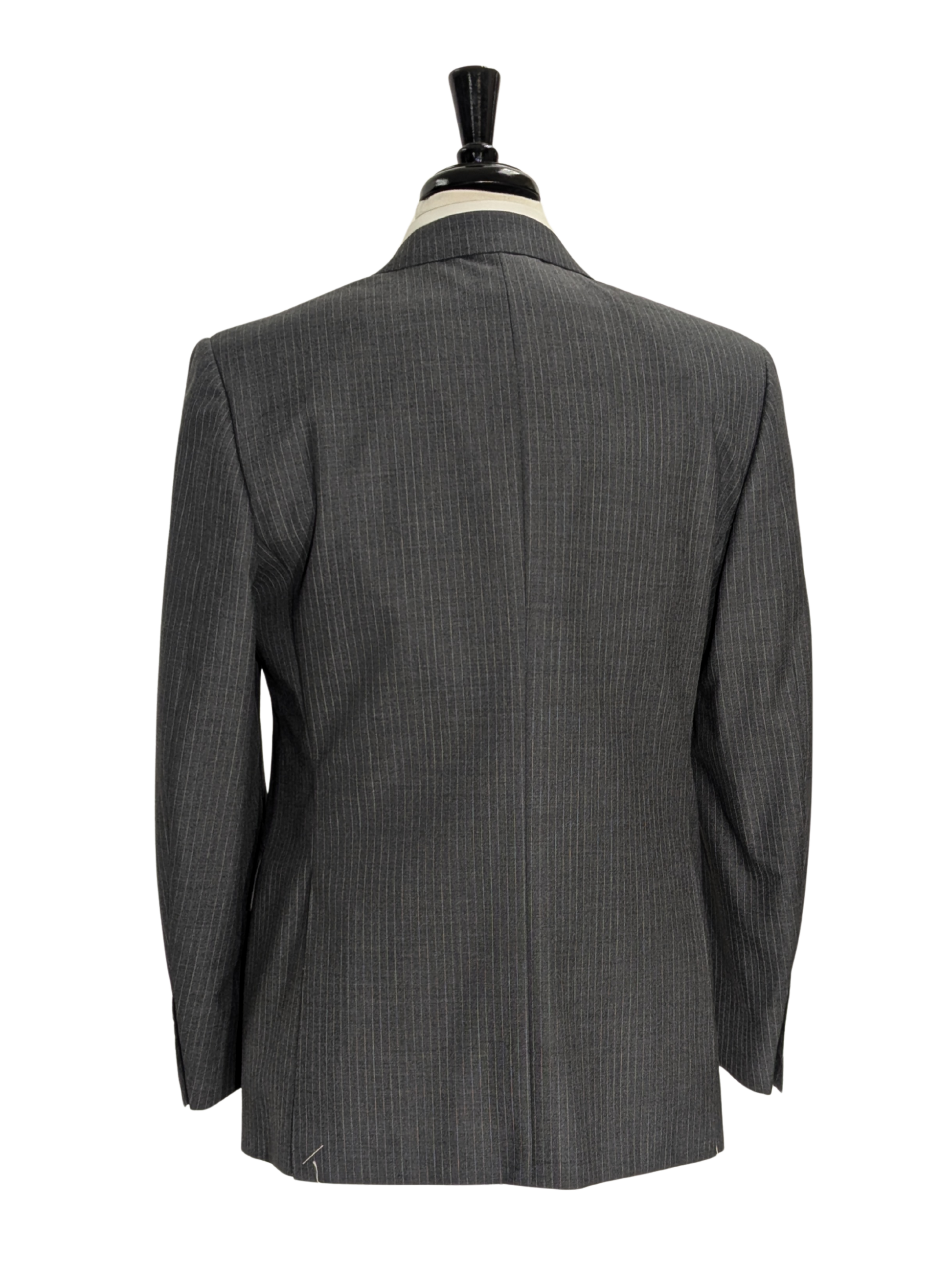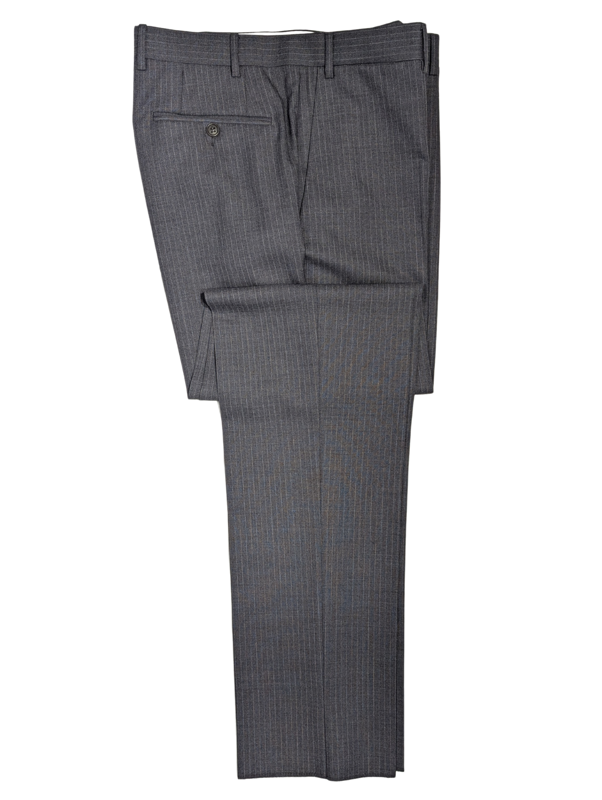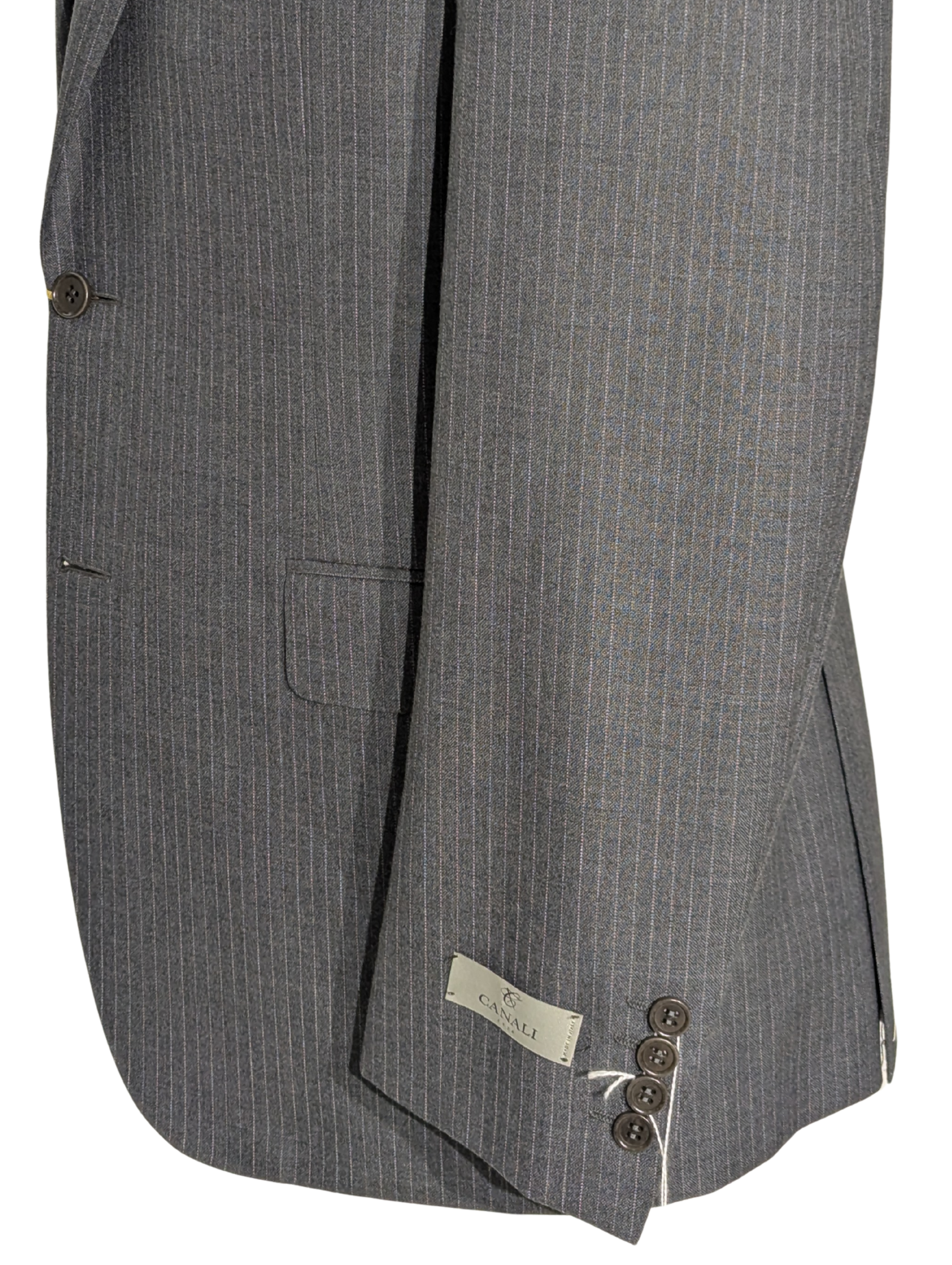 Elevate your formal wardrobe with this Canali two-piece suit, meticulously crafted in Italy from 100% wool. It features a dark gray base with subtle white pinstripes for a classic, refined look. The fully lined, fully canvassed jacket is designed with a two-button closure, notch lapels, and dual side vents for a clean, comfortable silhouette. It’s paired with flat-front trousers, unhemmed and ready to be finished to your exact measurements. An ideal choice for any professional setting.