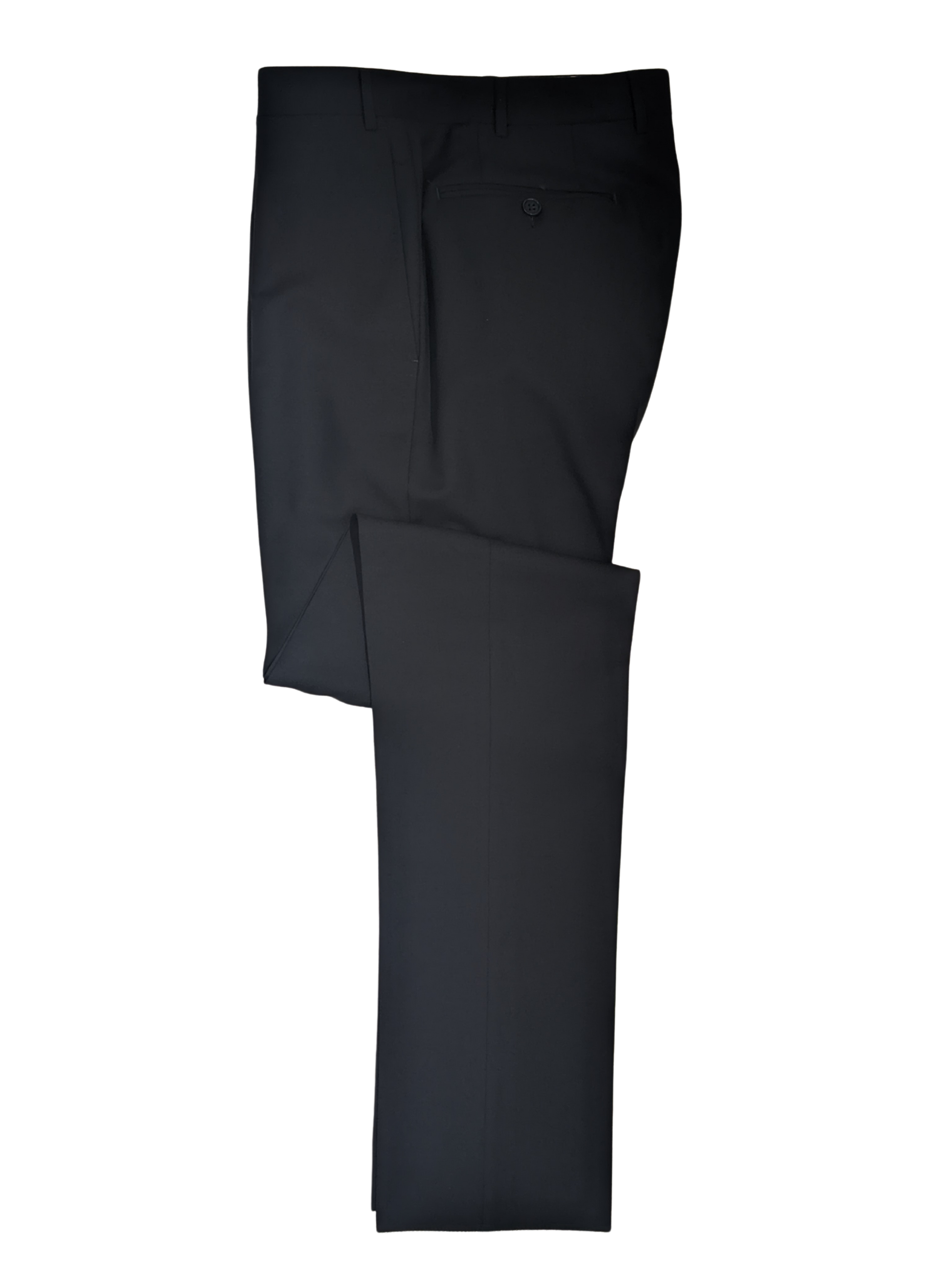 - Flat front pants, unhemmed.