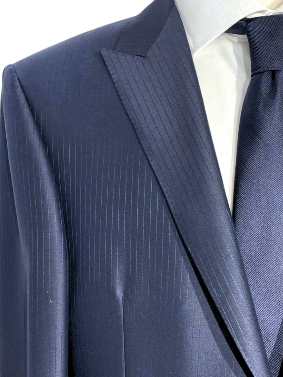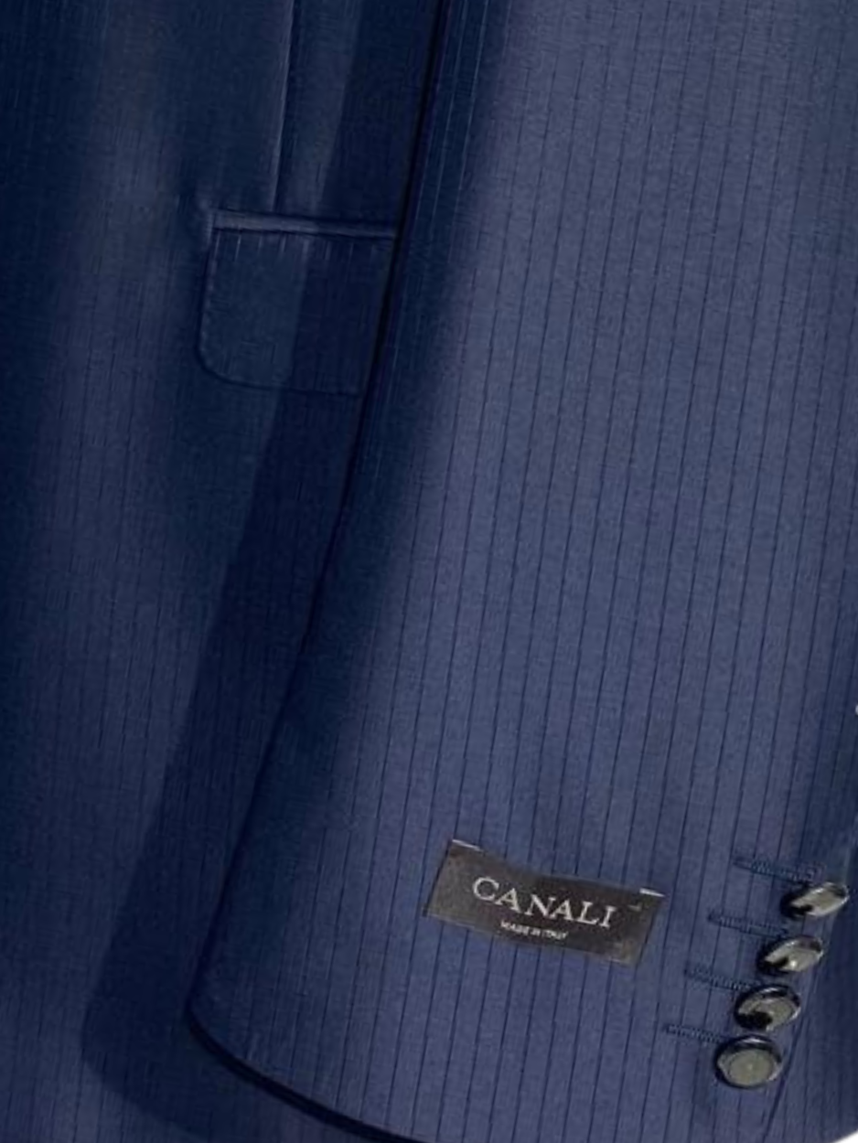 This Canali navy blue subtle pinstriped suit is crafted from 60% wool and 40% silk in a slim fit. It features a peak lapel, two-button front, and side vents for comfort and mobility. The subtle pinstriped pattern adds depth without overpowering, making it ideal for both business and formal wear. Finished with flap pockets and flat-front trousers, this suit reflects timeless Italian tailoring.