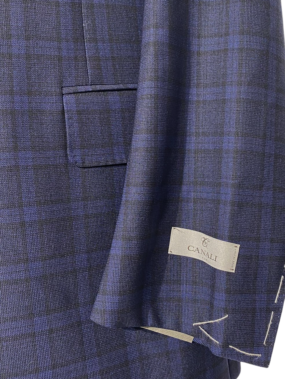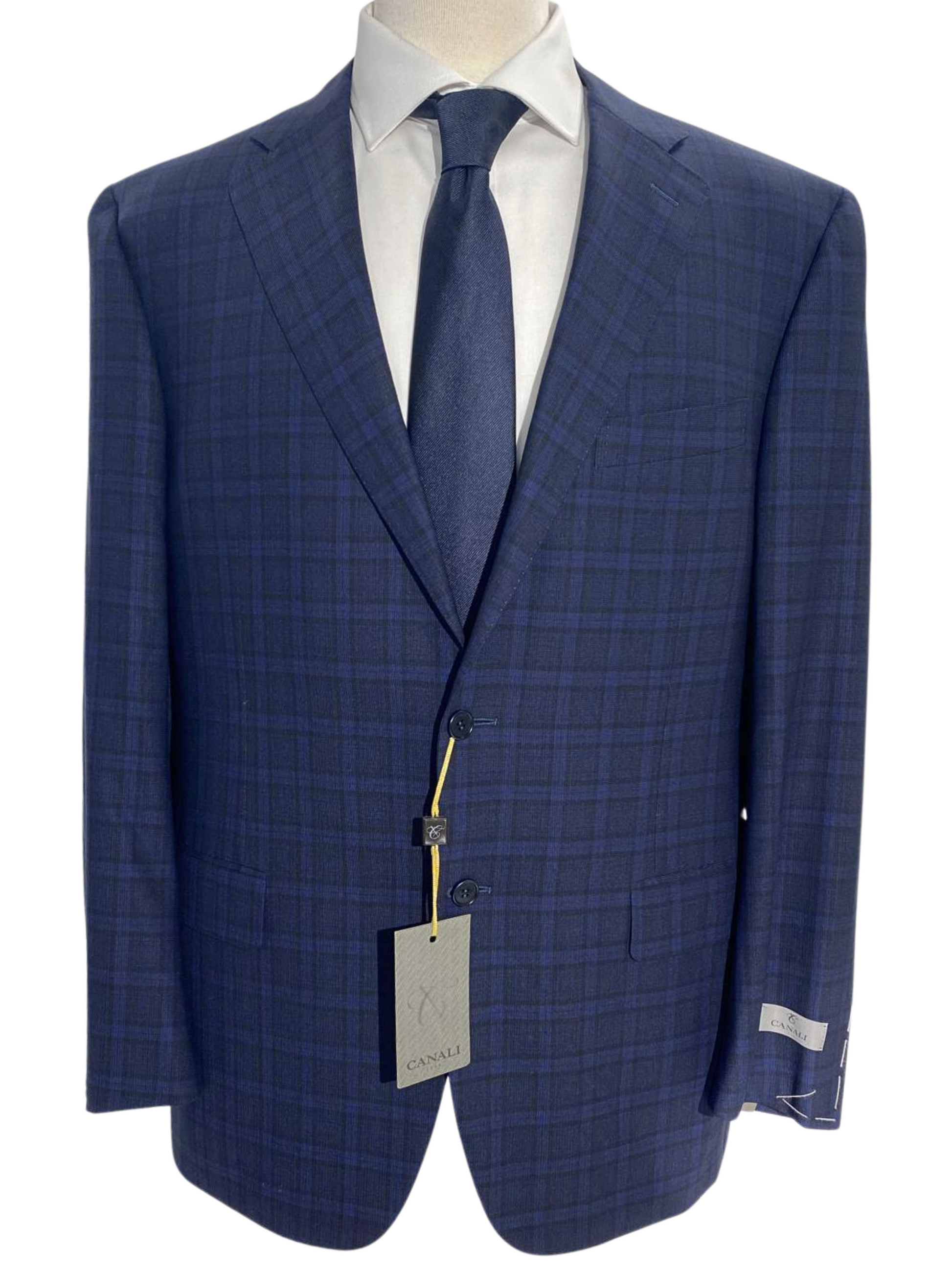 Canali Navy Blue Windowpane Plaid Notch Lapel 100% Wool 2 Button Suit 44L