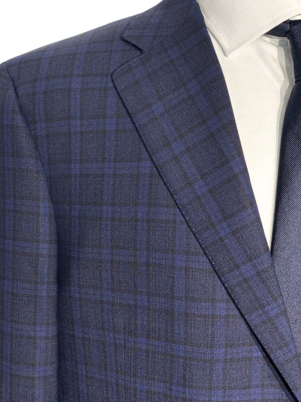 This Canali navy blue windowpane plaid suit is crafted from 100% wool. It features a notch lapel, two-button front, and side vents for comfort and mobility. The windowpane plaid pattern adds depth without overpowering, making it ideal for both business and formal wear. This suit reflects timeless Italian tailoring.