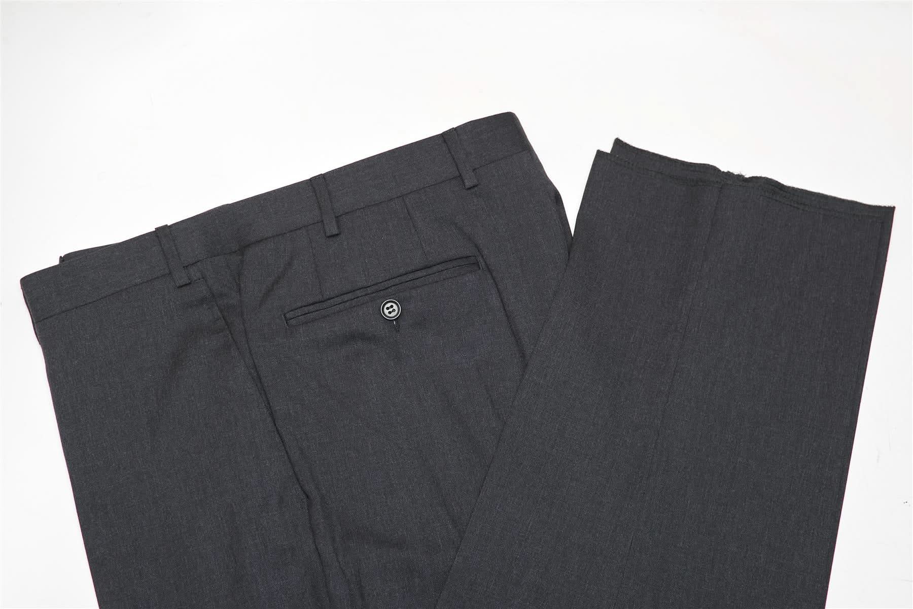 - Flat front pants, unhemmed.