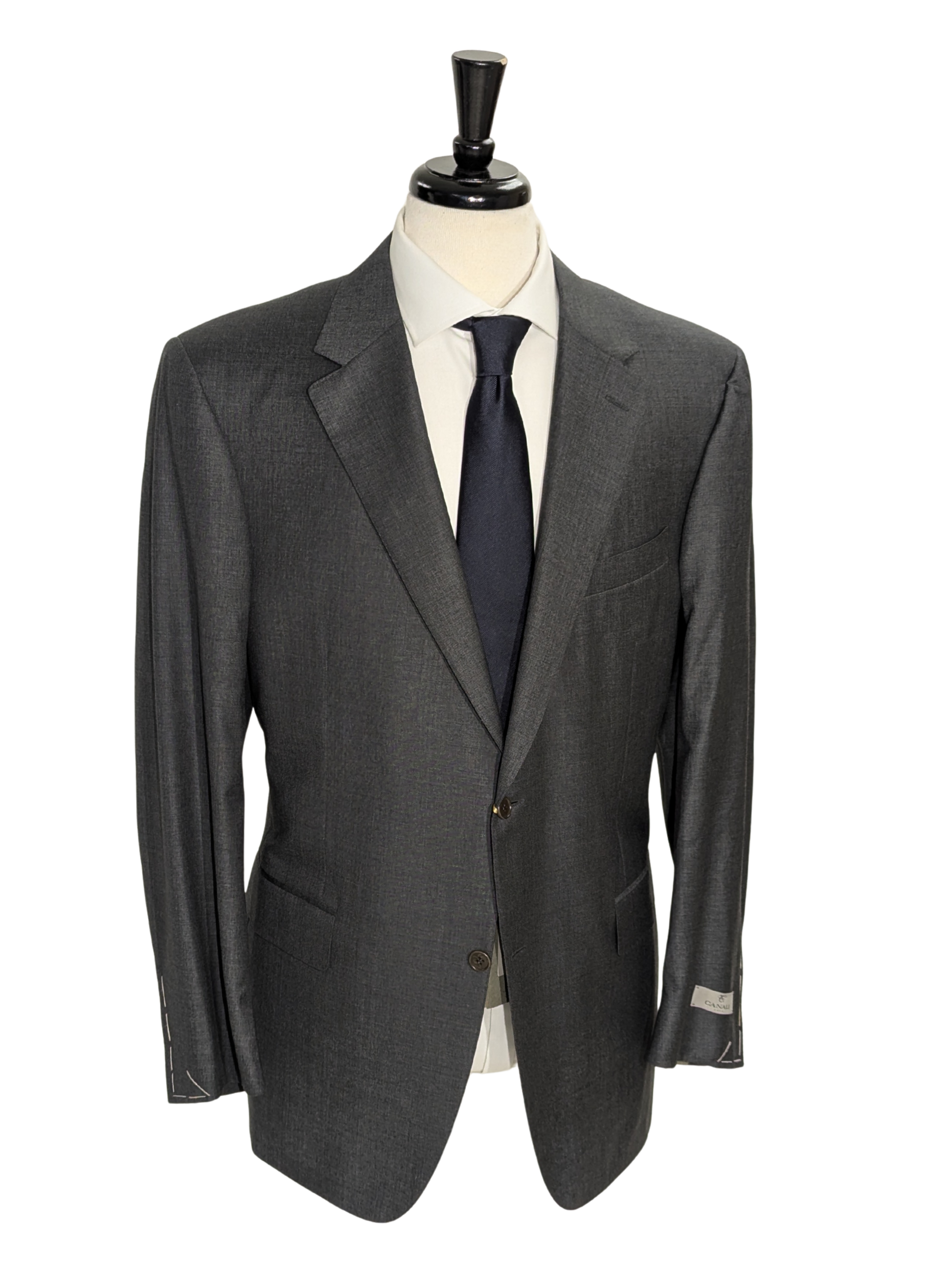 This Canali solid gray wool suit offers timeless elegance with Italian precision. Crafted from premium wool in a versatile gray tone, it delivers a clean, classic silhouette suitable for both business and formal settings. The jacket is fully canvassed for long-lasting structure and impeccable drape, featuring full lining, dual side vents, and a two-button front with notch lapels. Traditional pleated trousers complement the jacket. A wardrobe essential from Canali, known for understated luxury and expert craftsmanship.
