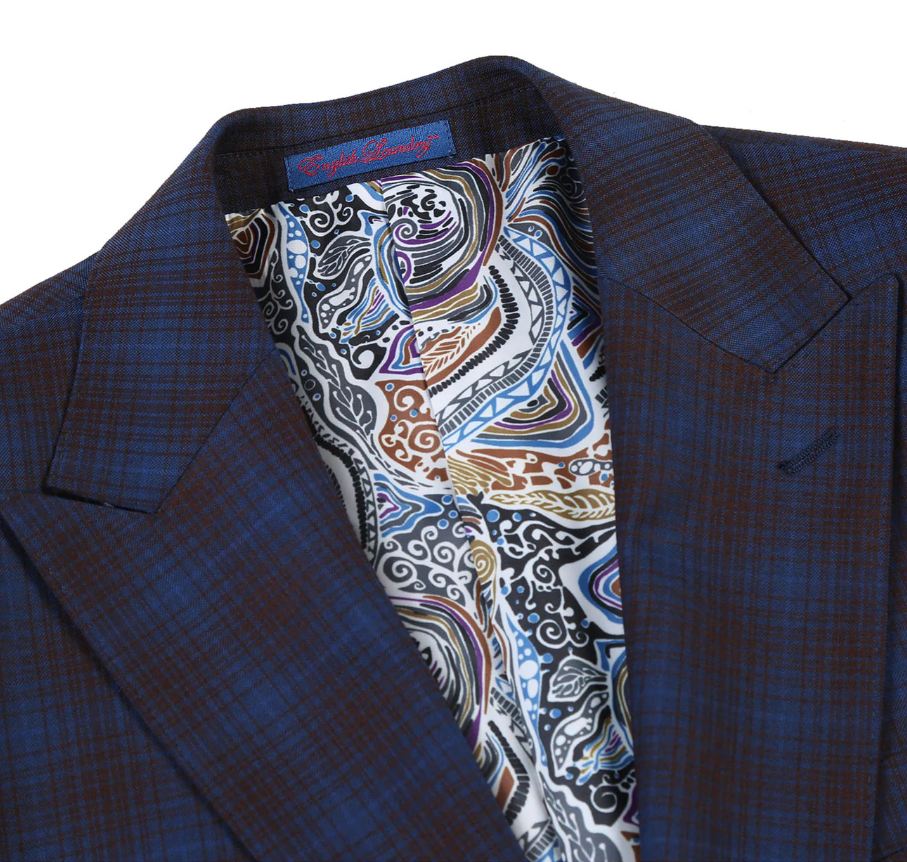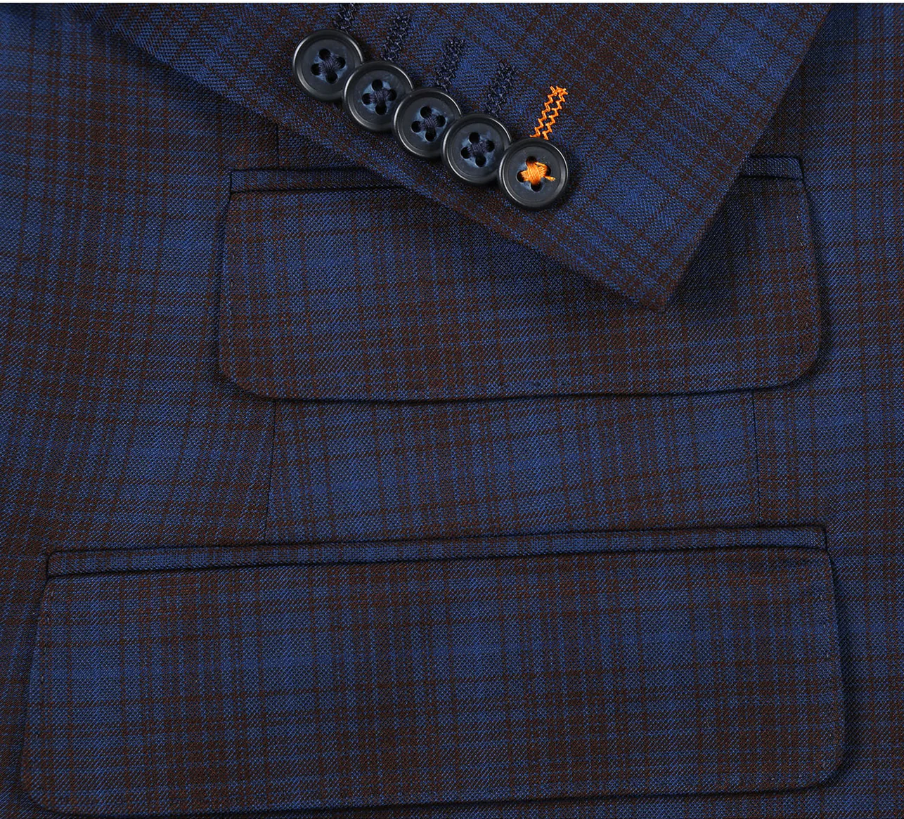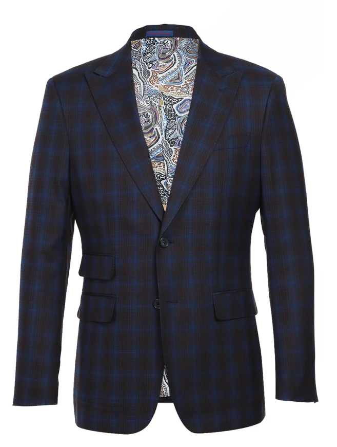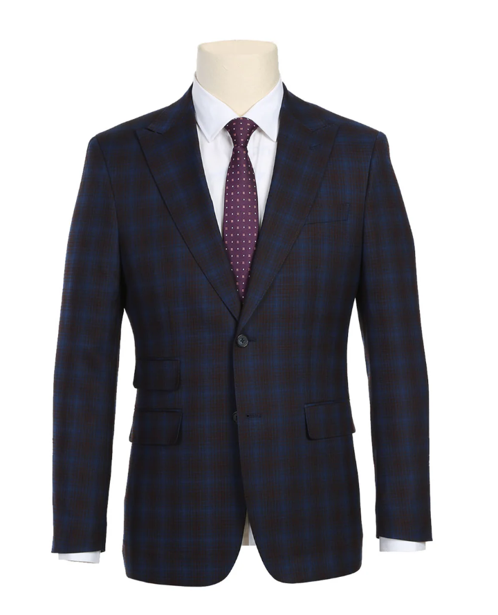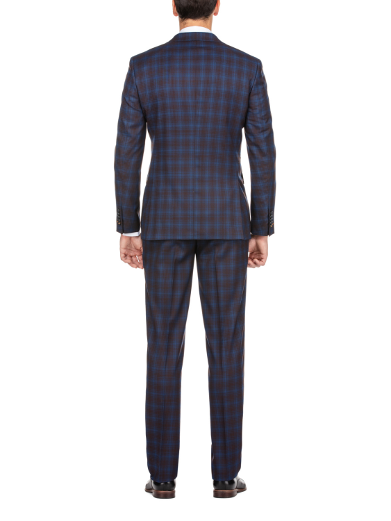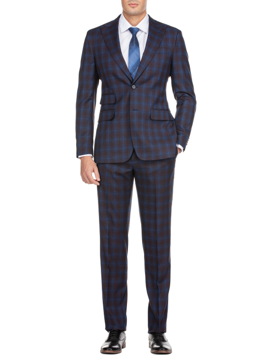 English Laundry Mens Navy with Brown Check Slim Fit Peak Lapel 2 Button Stretch Suit