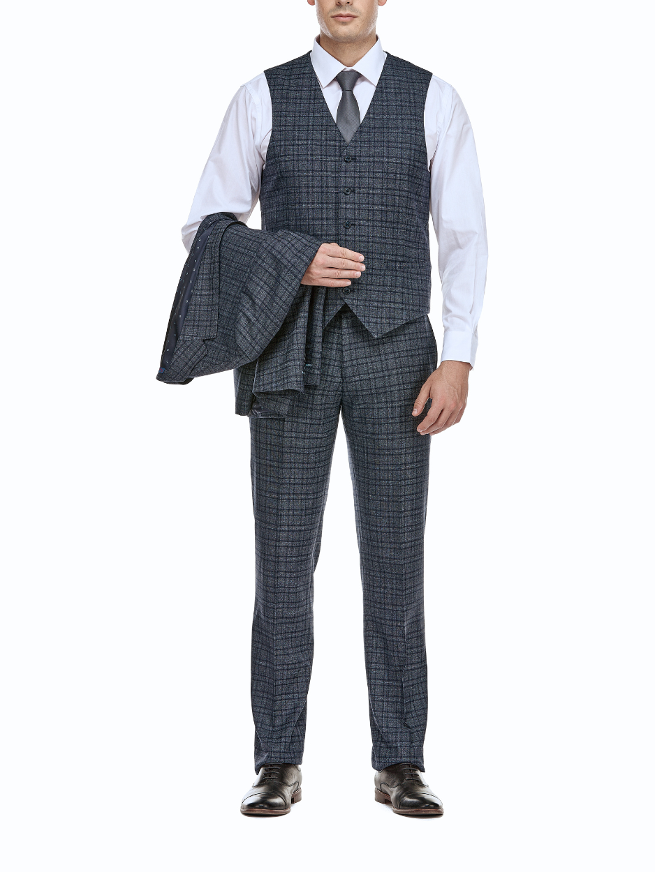 - Includes flat front trousers, a vest and a notch-lapel jacket.