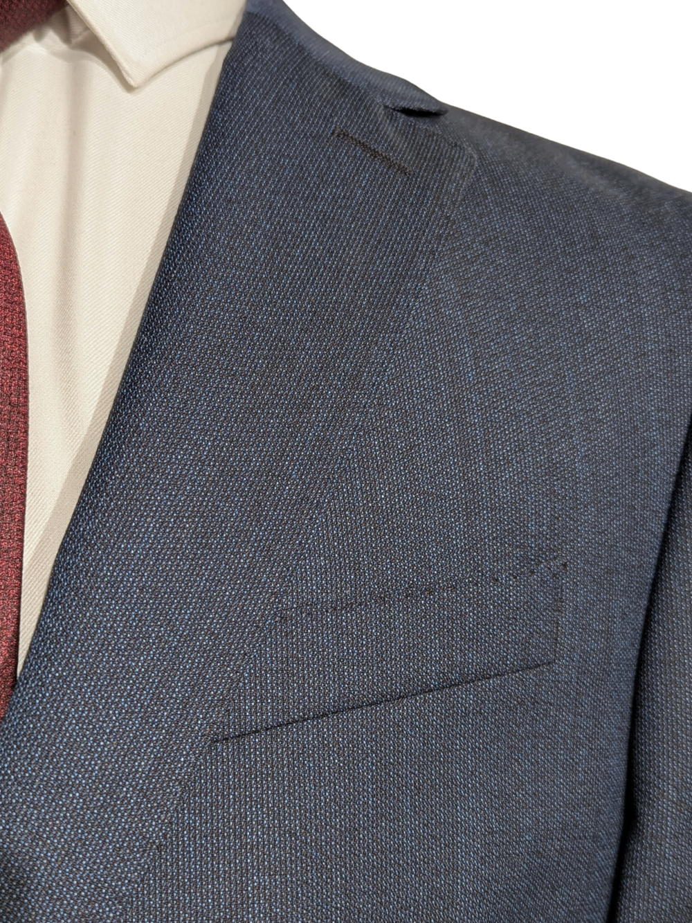 This Hugo Boss suit is crafted from luxurious Super 120s wool by Drago, offering a soft hand feel with excellent drape and durability. The textured navy fabric adds subtle depth, while notch lapels and a 2-button front create a timeless, tailored look. Ideal for business or formal occasions, it’s a refined wardrobe essential with modern appeal.