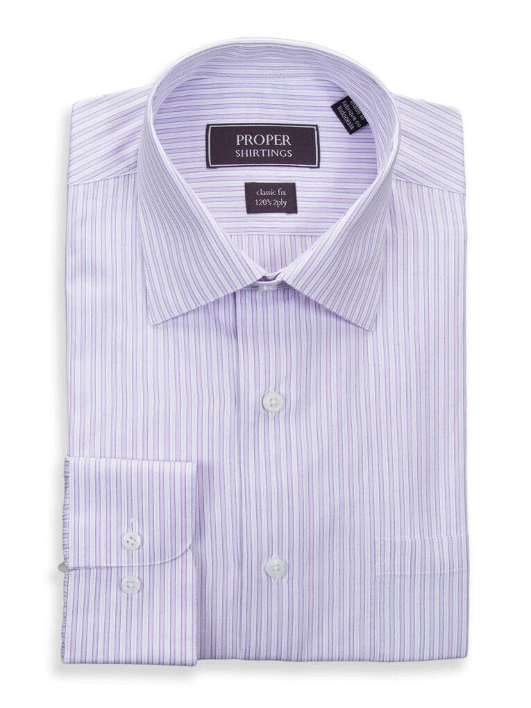 Mens Classic Fit Lavender Striped Spread Collar 120's 2ply Cotton Dress Shirt