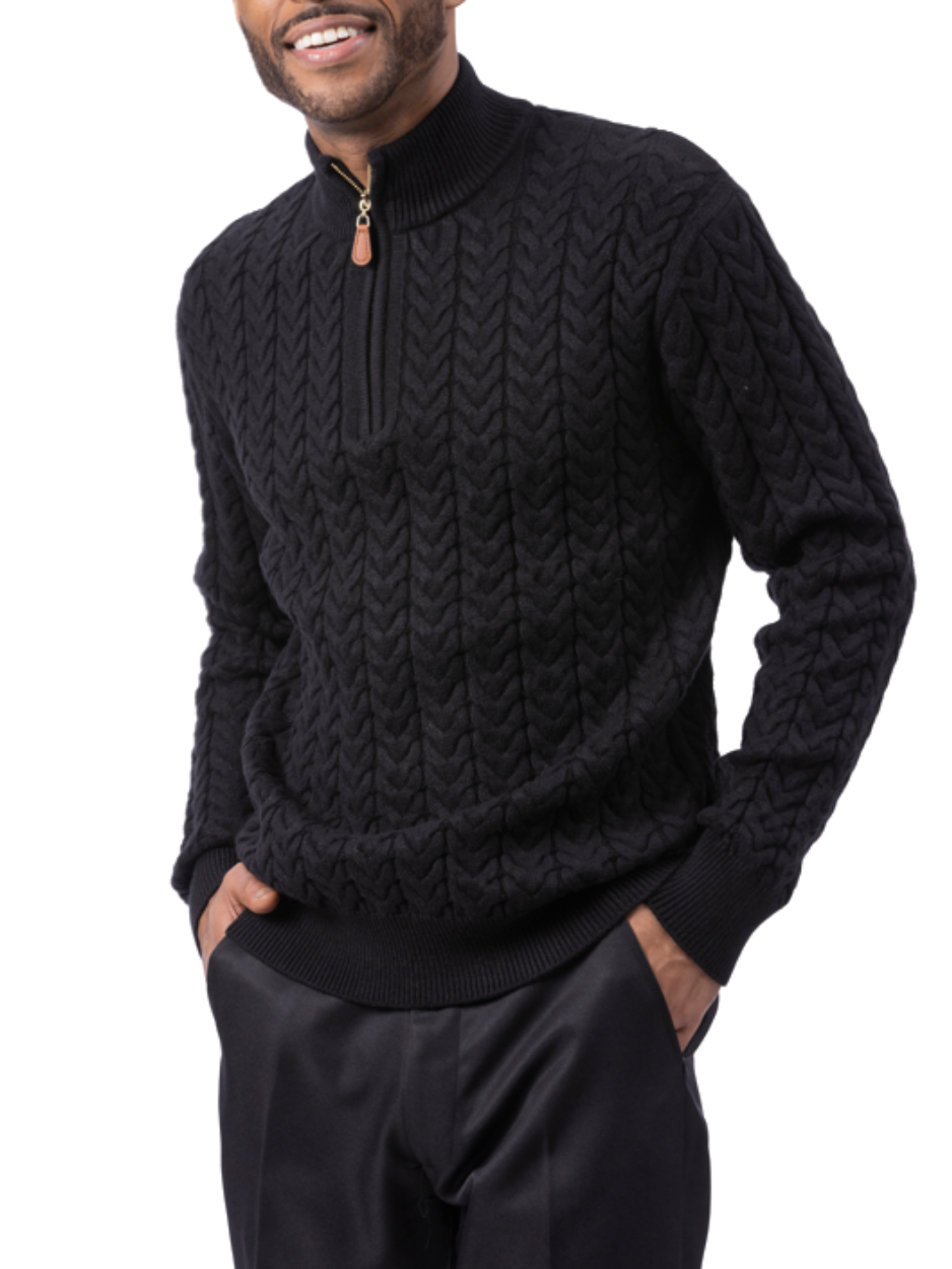 Montique Black Chevron Cable Regular Fit Quarter Zip Cotton Knit Sweater