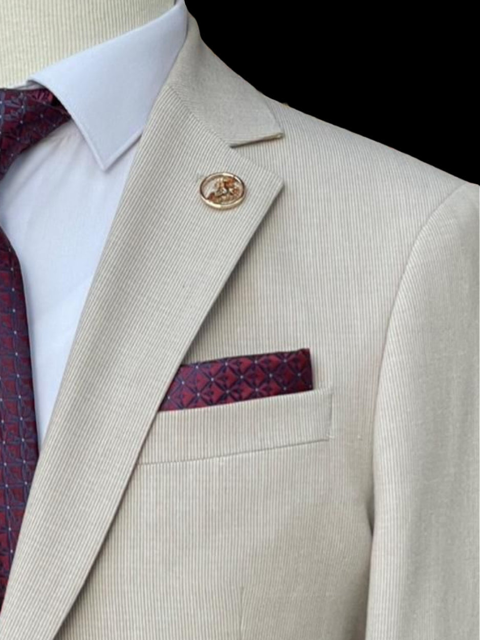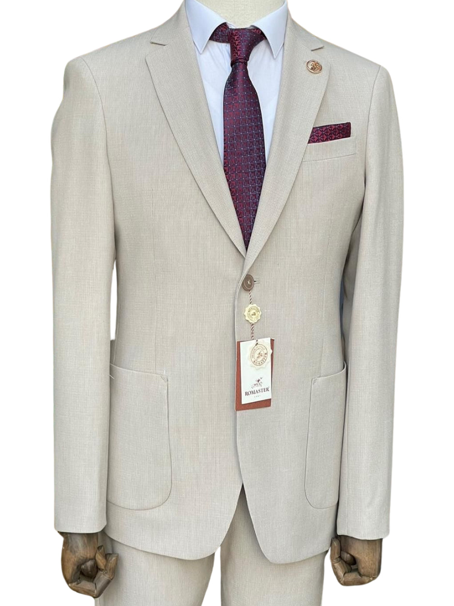 Step into effortless style with this beige pinstriped suit, tailored for modern sophistication. Made from a 90% linen, 10% Lycra blend for breathable comfort and light stretch. Slim fit with notch lapel and patch pockets for a relaxed, refined look. Ideal for summer events, travel, and elevated casual wear.
