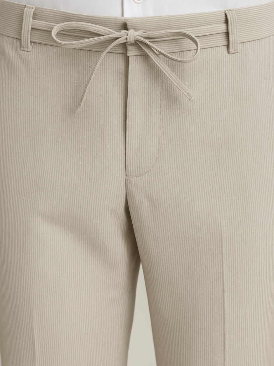 Pierre Carlos Pinstriped Beige Slim Fit Stretch Linen Suit with Drawstring Waist