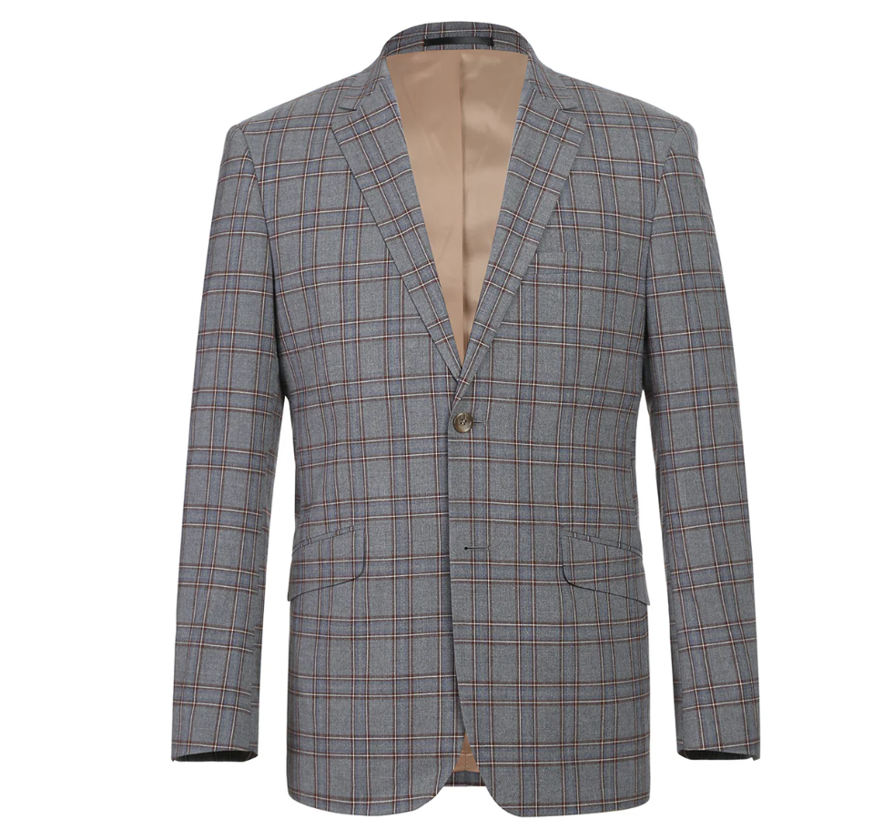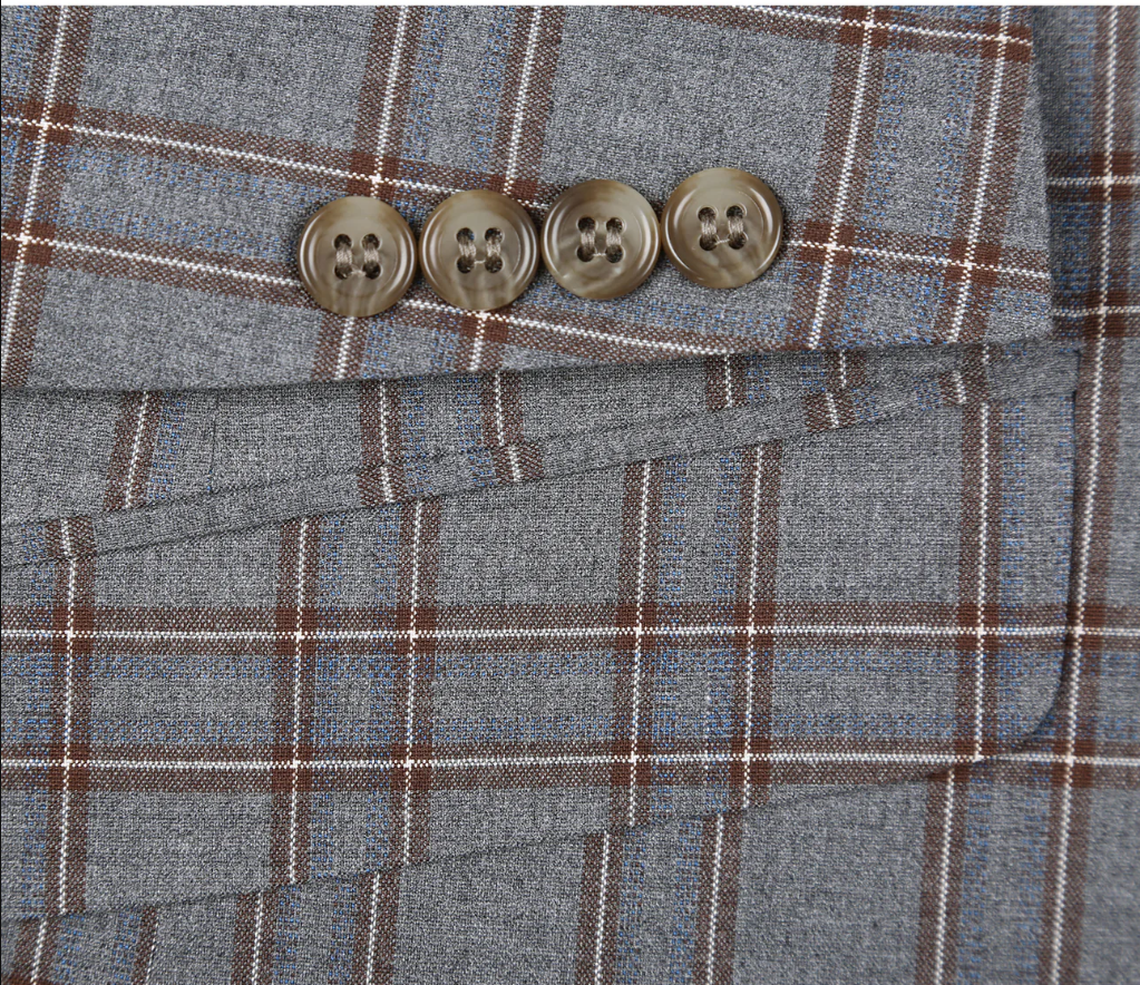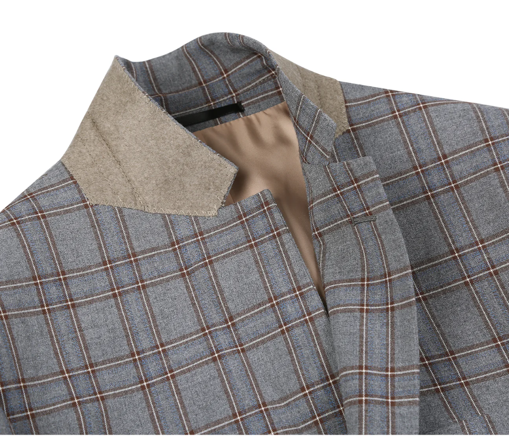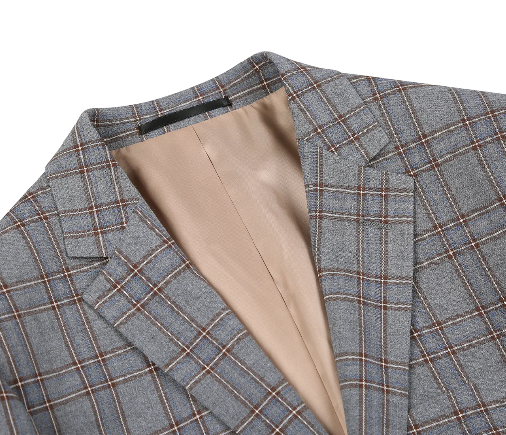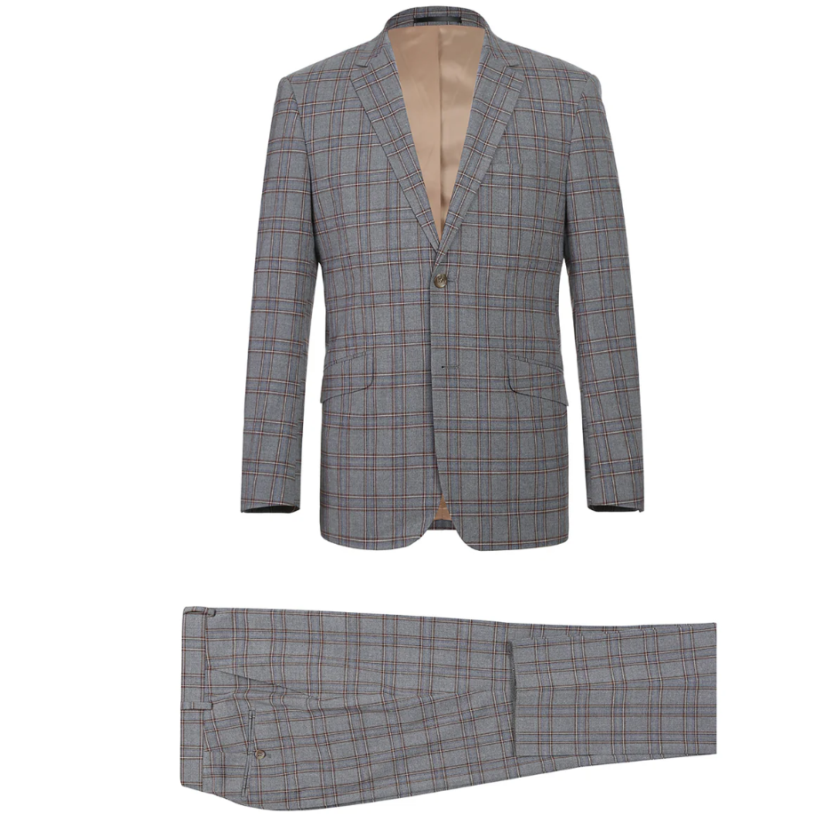 This Grey windowpane check stretch suit offers a modern twist on a timeless pattern. Crafted from a comfortable stretch fabric, it moves with you while maintaining a sharp, tailored look. The grey base with bold red and blue windowpane lines creates a versatile style that works for the office, weddings, or smart casual events.