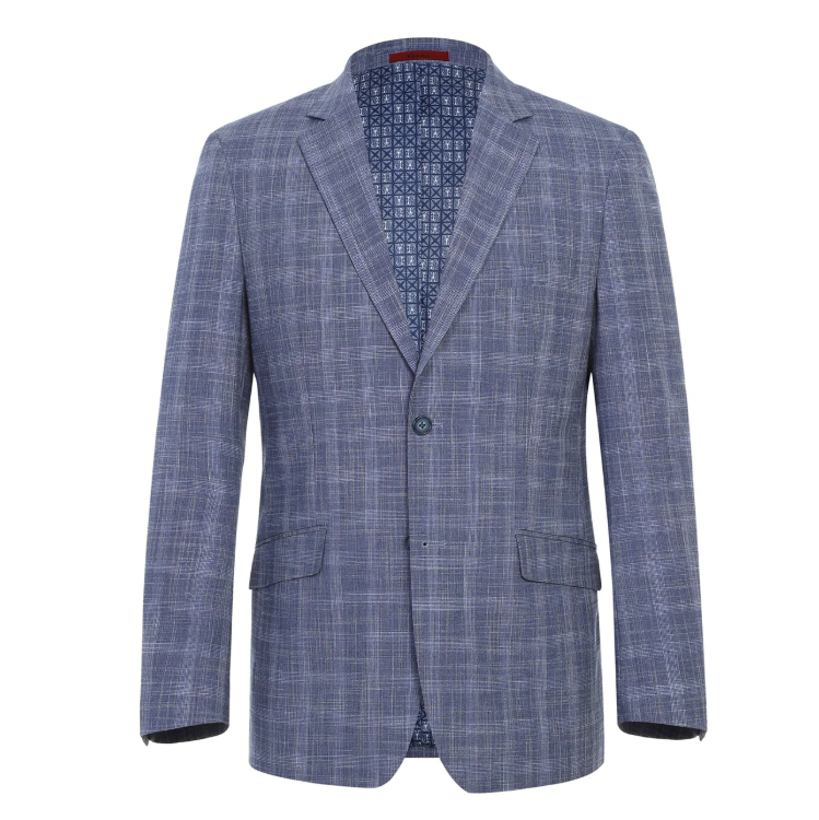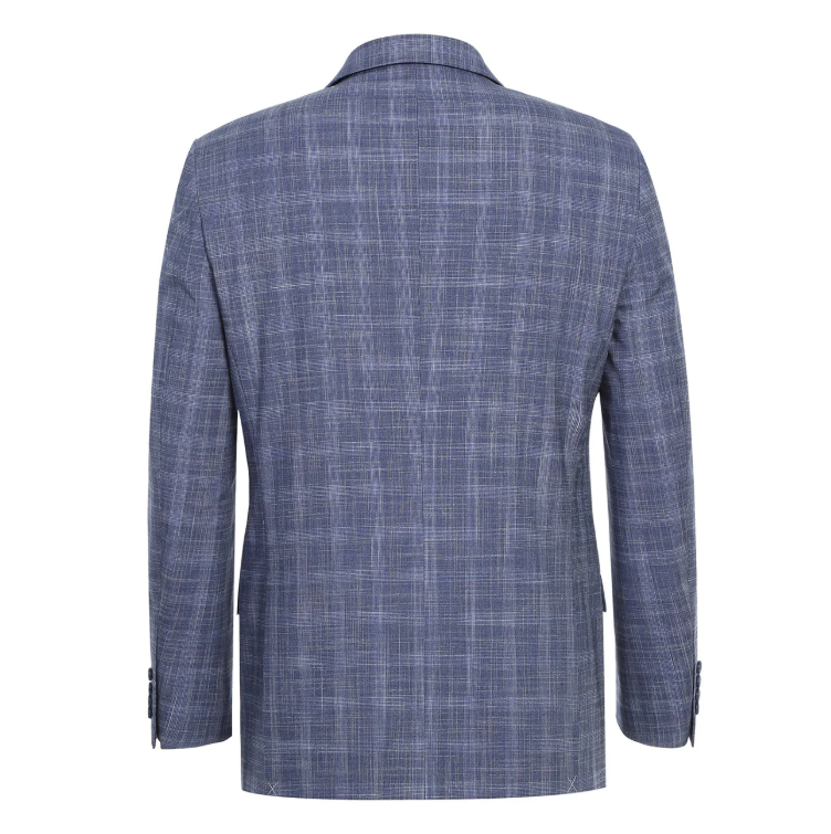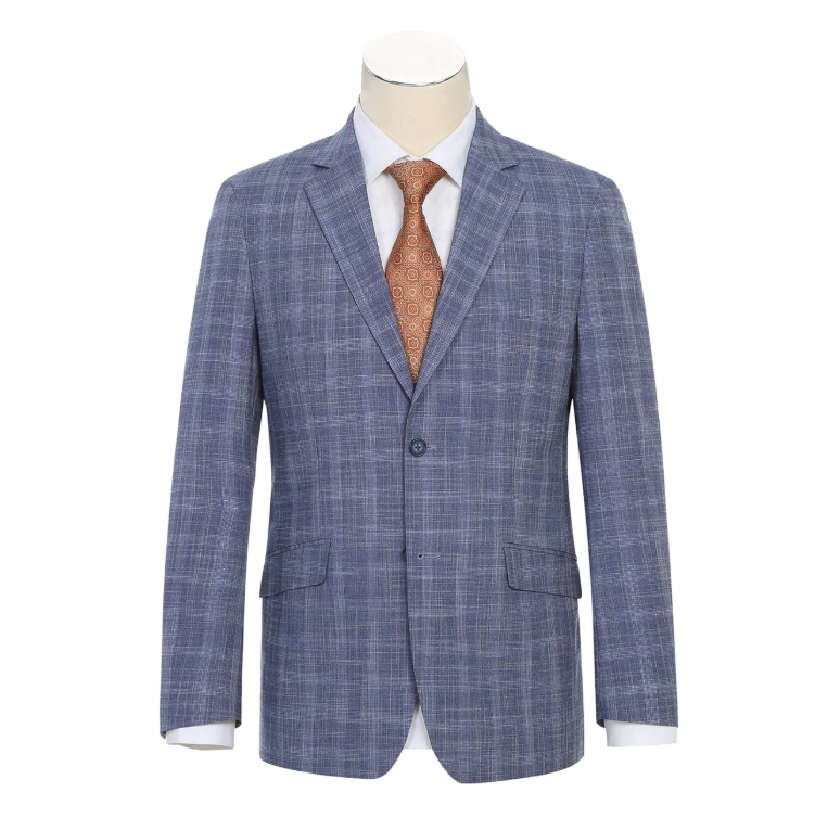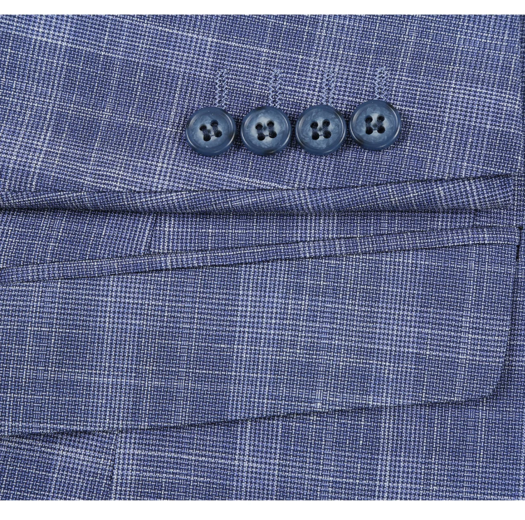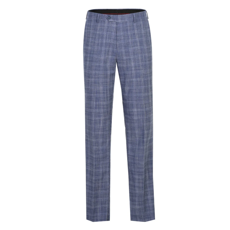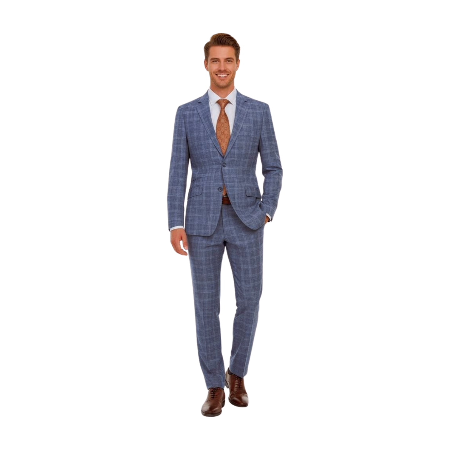 This slim fit blue suit features a check pattern that adds depth and character to its modern style. The jacket includes a notch lapel, two-button front, and flap pockets for a refined, traditional look. Its comfortable slim fit pairs perfectly with matching trousers, making it a standout choice for summer weddings, daytime events, and business occasions.