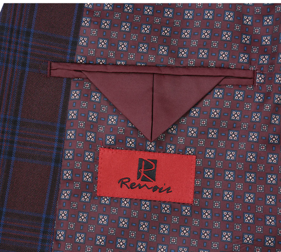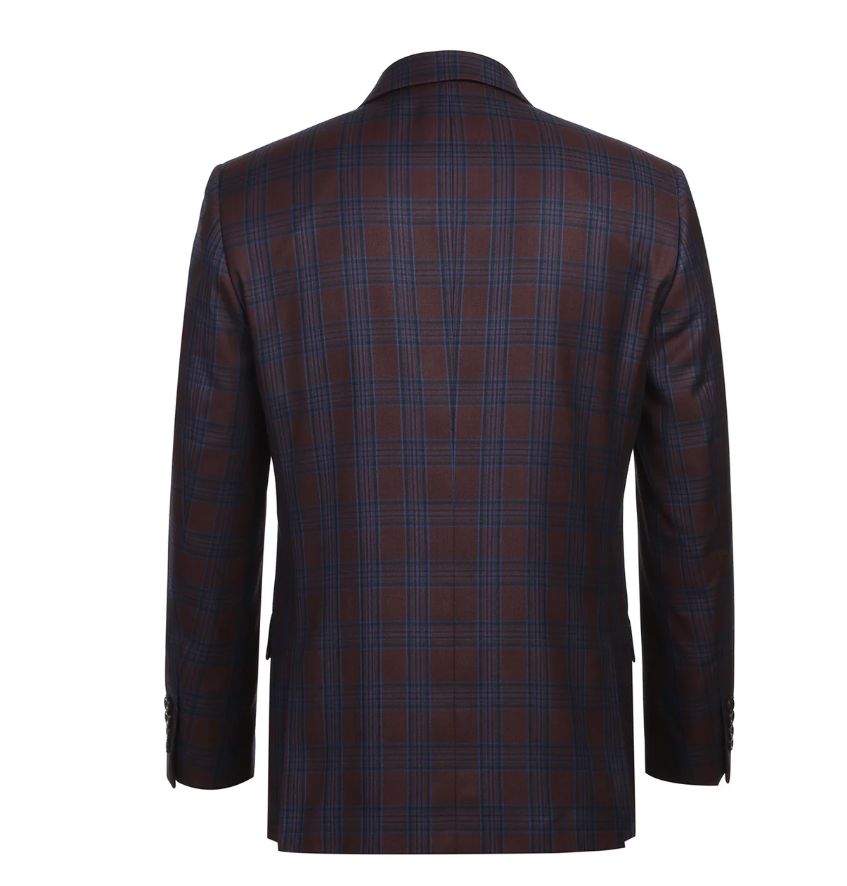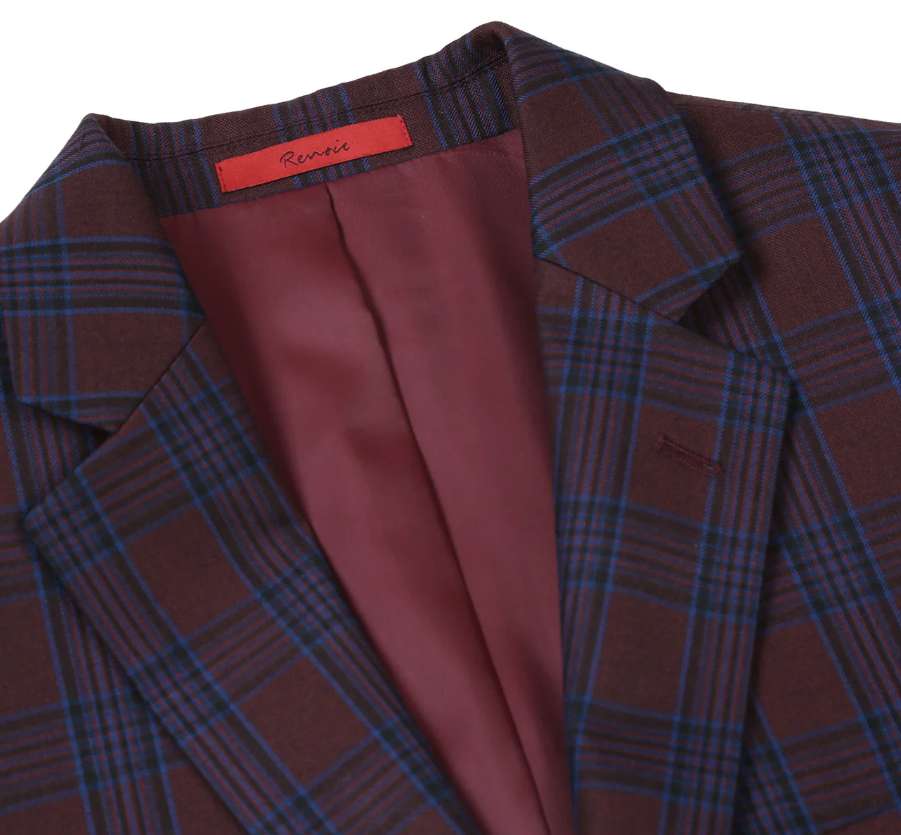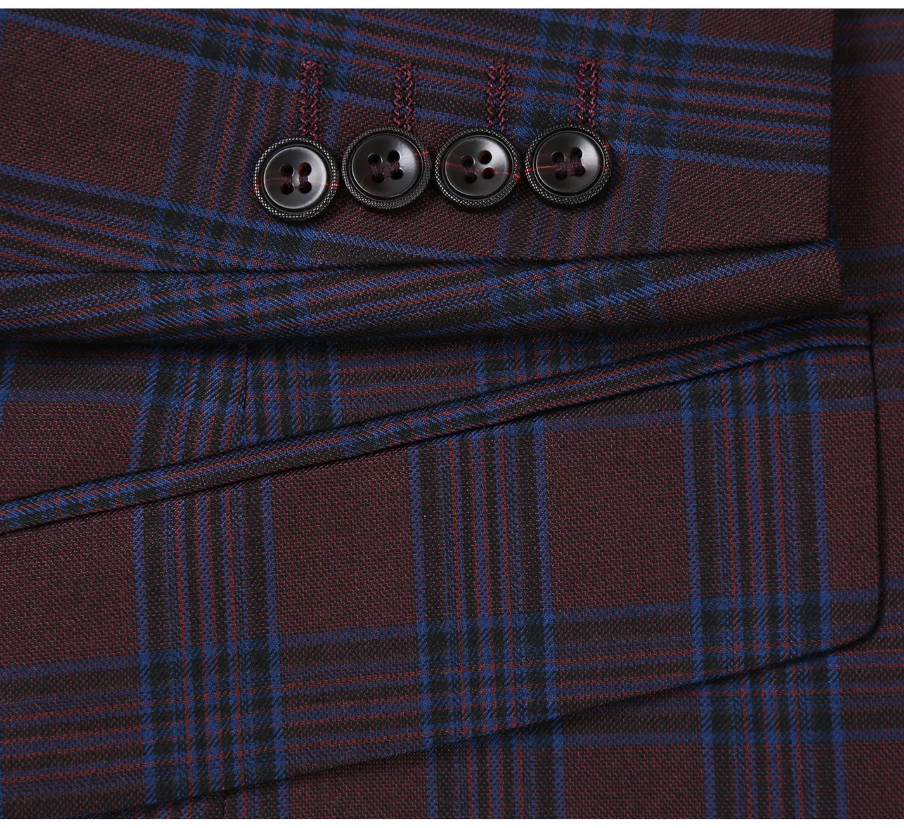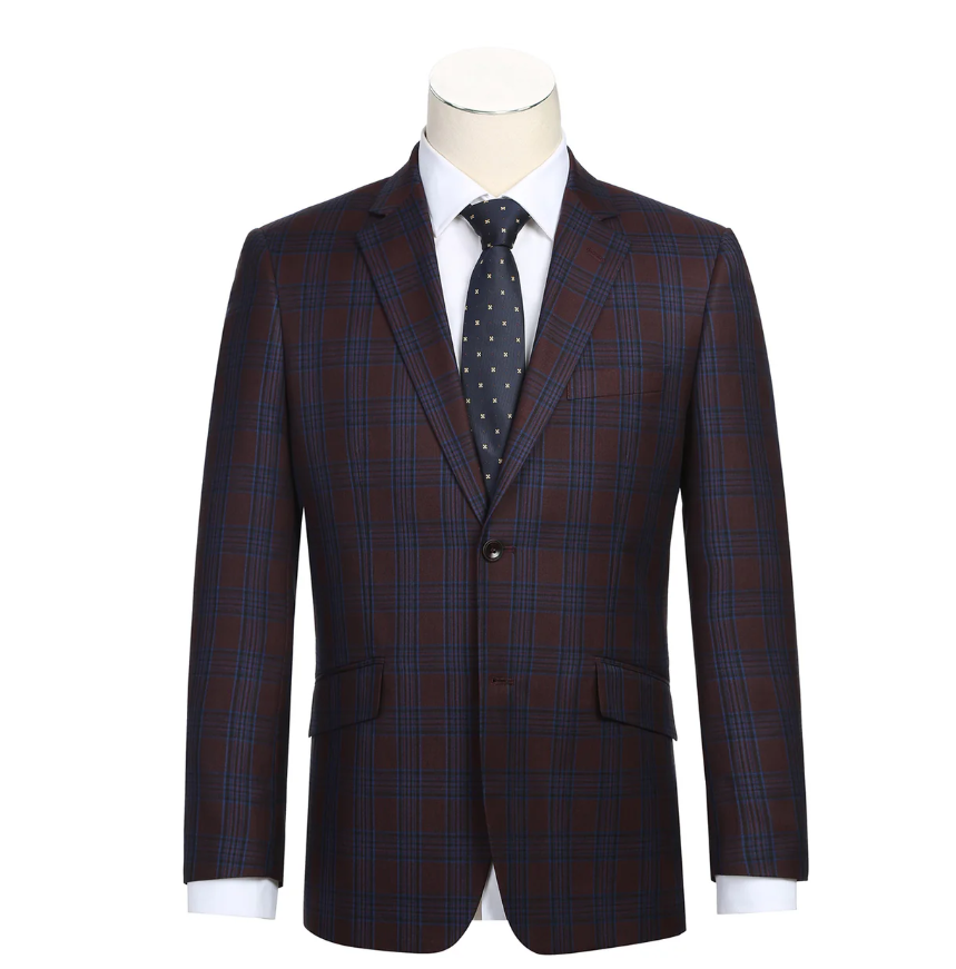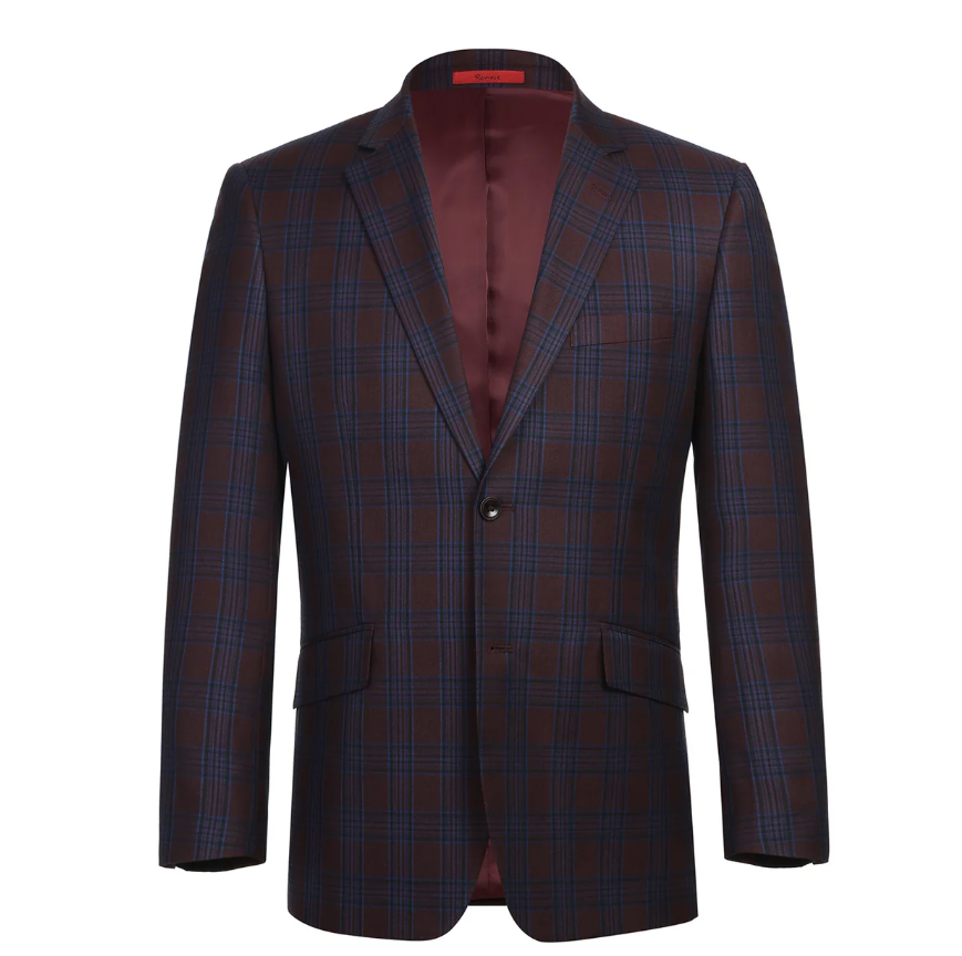 Raphael Men’s Burgundy and Blue Plaid Slim Fit Notch Lapel Blazer