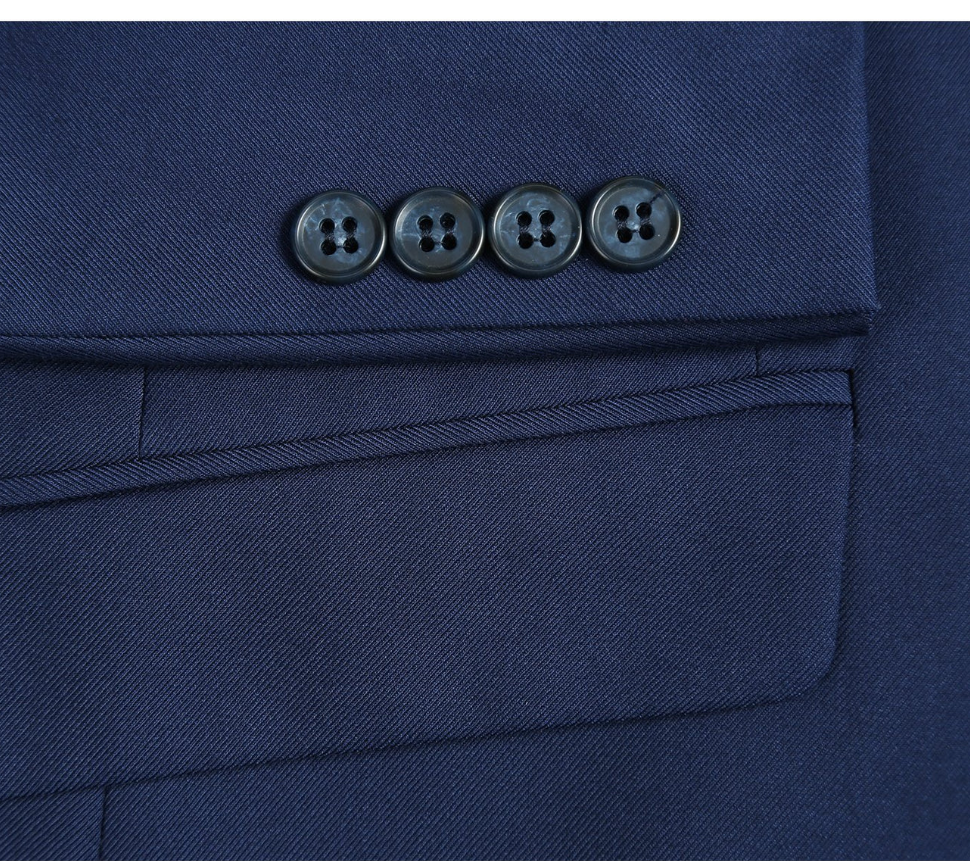 This slim fit navy blue suit, designed for timeless style and all-day comfort. The jacket features a two-button, single-breasted front with sharp notch lapels, flap pockets, and side vents for ease of movement. The coordinating trousers offer a straight-leg cut with a flat front for a clean, refined look. Perfect for both professional settings and formal occasions, this deep navy suit pairs effortlessly with a variety of shirt and tie combinations, making it a versatile staple in any gentleman’s wardrobe.