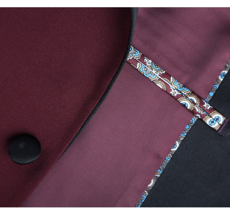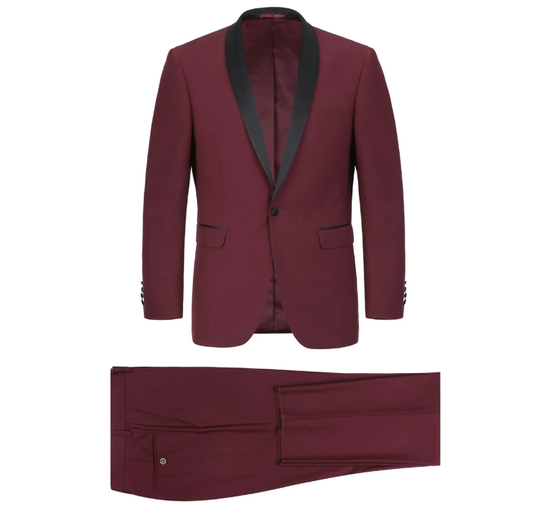 Here is proof that an affordable tux can be perfectly tailored. Wear this sophisticated burgundy slim fit tuxedo for formal social events. This slim fit tux is constructed from premium synthetic fibers. The tailoring is impeccable. The seams are extra durable. This tux is ideal for wedding parties, groomsmen, and prom.