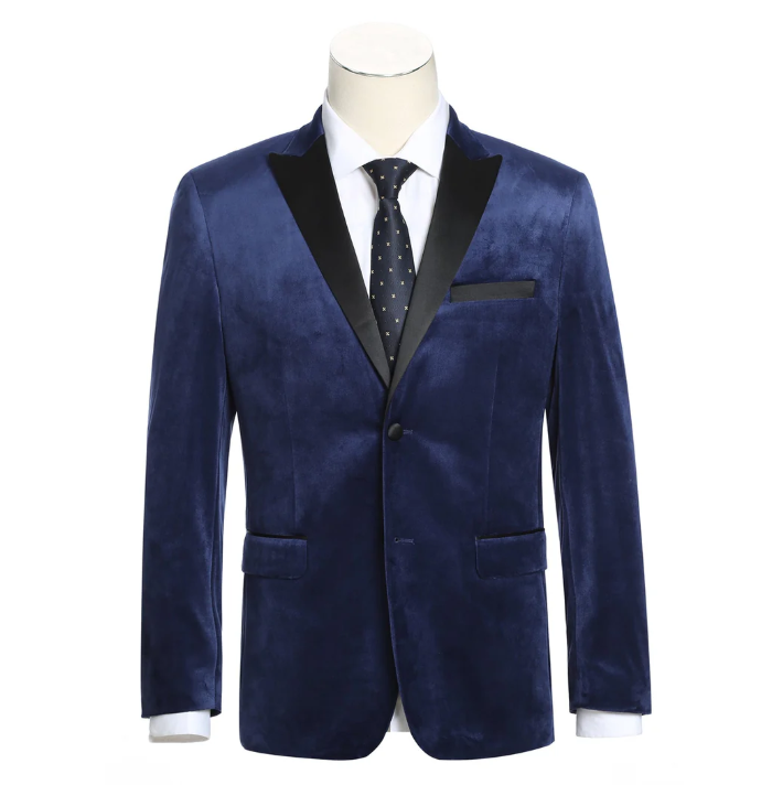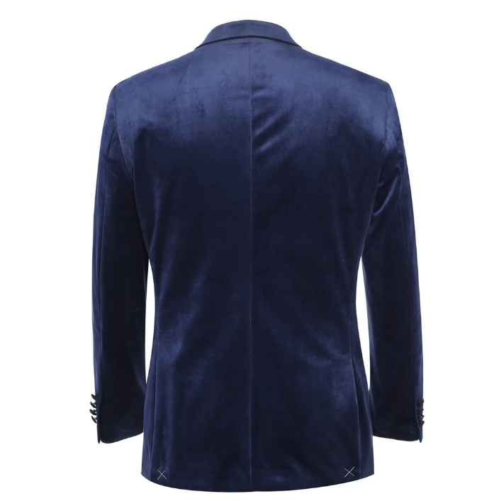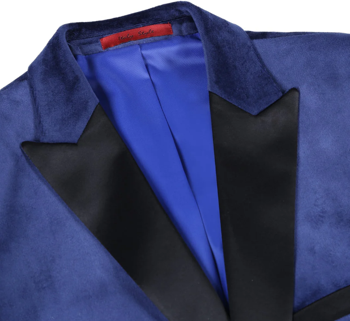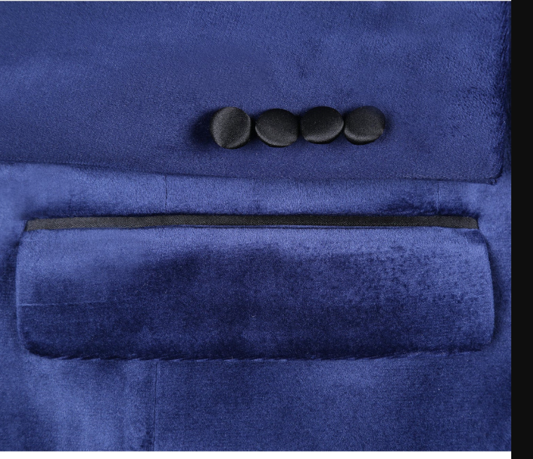 This rich navy velvet tuxedo blazer, designed for evenings when you want to stand out. The plush velvet offers a soft, luxurious feel, while the black satin peak lapel adds a refined touch. Finished with a two button closure, satin-trimmed breast pocket, and flap pockets, this jacket delivers timeless elegance with modern flair. A vibrant royal blue lining adds a bold pop of color inside. Perfect for weddings, galas, and upscale celebrations.