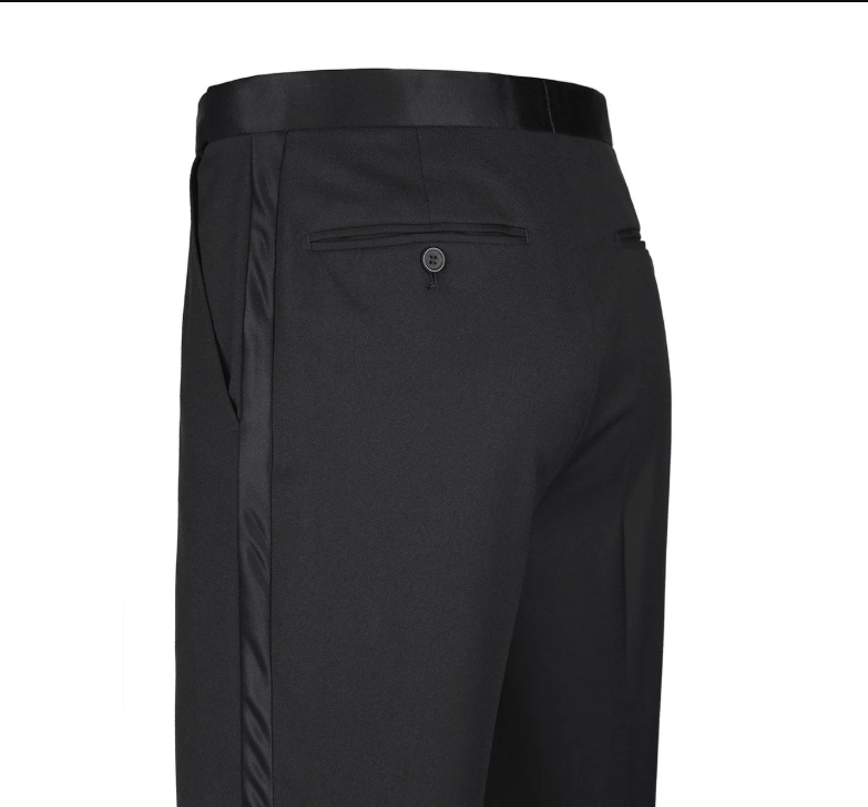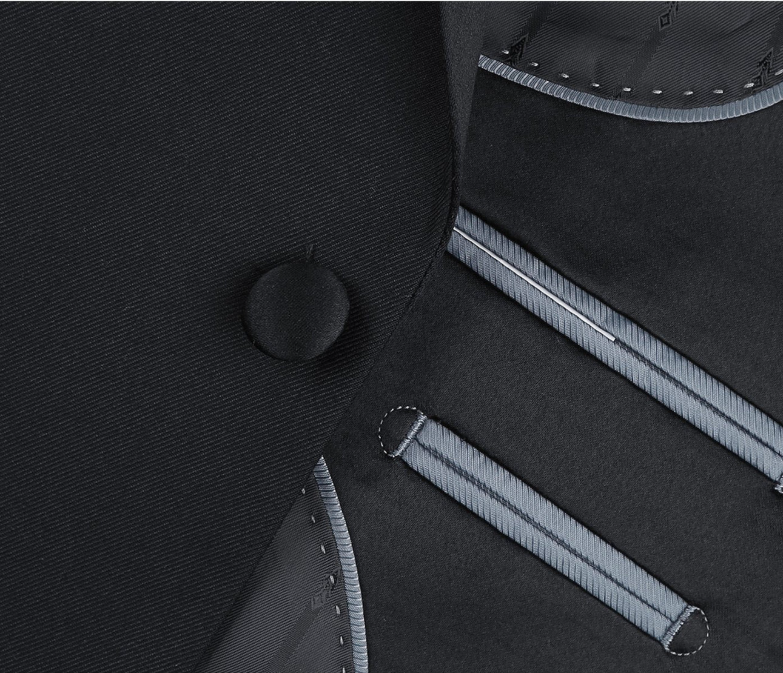 A busy social agenda requires a classic black tuxedo that'll always look sharp, and this Raphael tuxedo is faultlessly made for timeless elegance. This tuxedo is tailored from a polyester blend with satin notch collar and has covered buttons for a final flourish. The flat front pants are trimmed with satin ribbon that runs down both legs, and the pants are left unhemmed to allow tailoring for your exact fit.