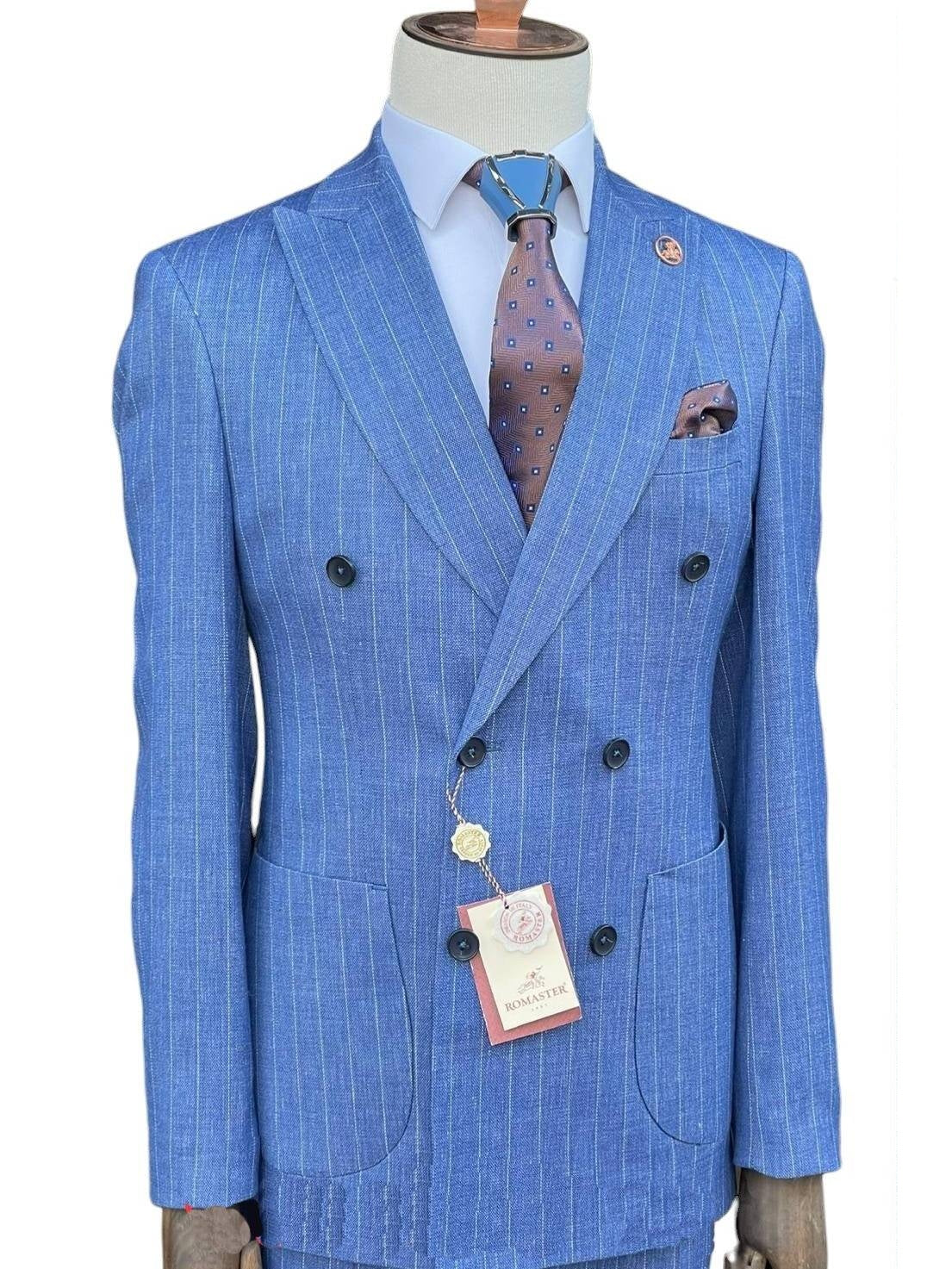Romaster Mens Slim Fit Blue Pinstriped Double Breasted Linen Blend 2 Piece Suit