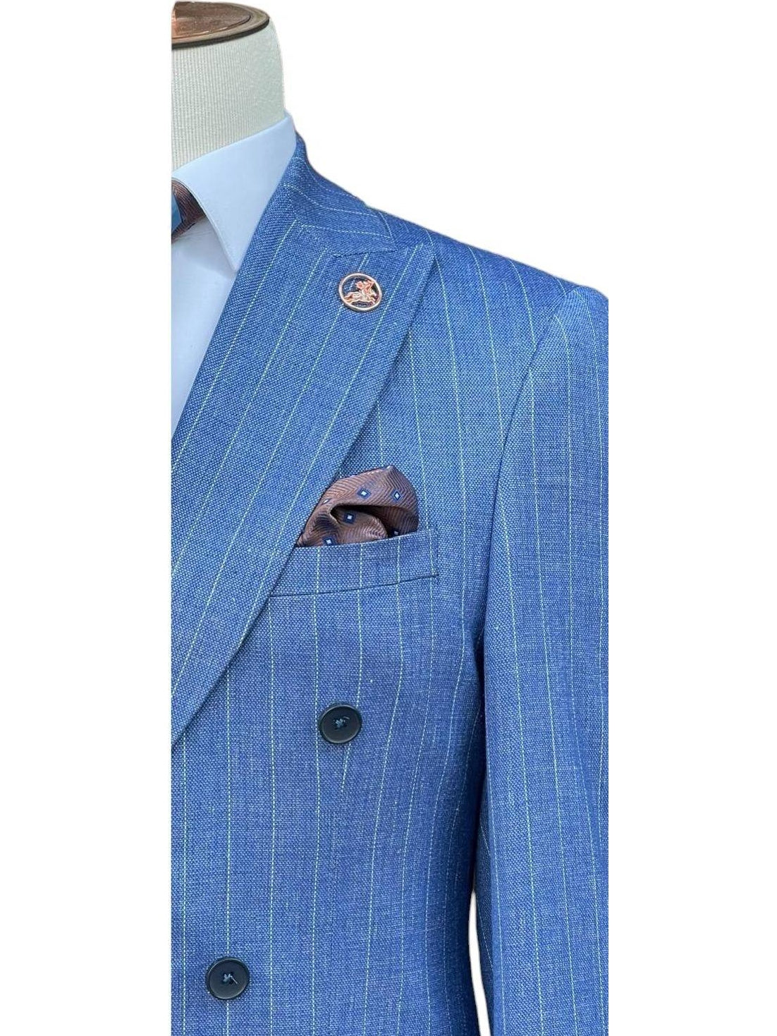 This Slim Fit Blue Pinstriped Double Breasted Suit is made from linen blend fabric that drapes superbly across the body. The slim fit is modern and sharp. It’s the perfect suit for wedding parties and groomsmen, as well as for year-round business wear.