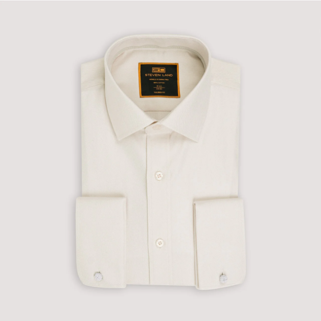 This Steven Land tailored fit cream herringbone dress shirt is a refined wardrobe essential, crafted from wrinkle- and shrink-resistant cotton for lasting comfort and easy care. Featuring a modern spread collar and french cuffs, it pairs effortlessly with suits, blazers, or dress trousers.