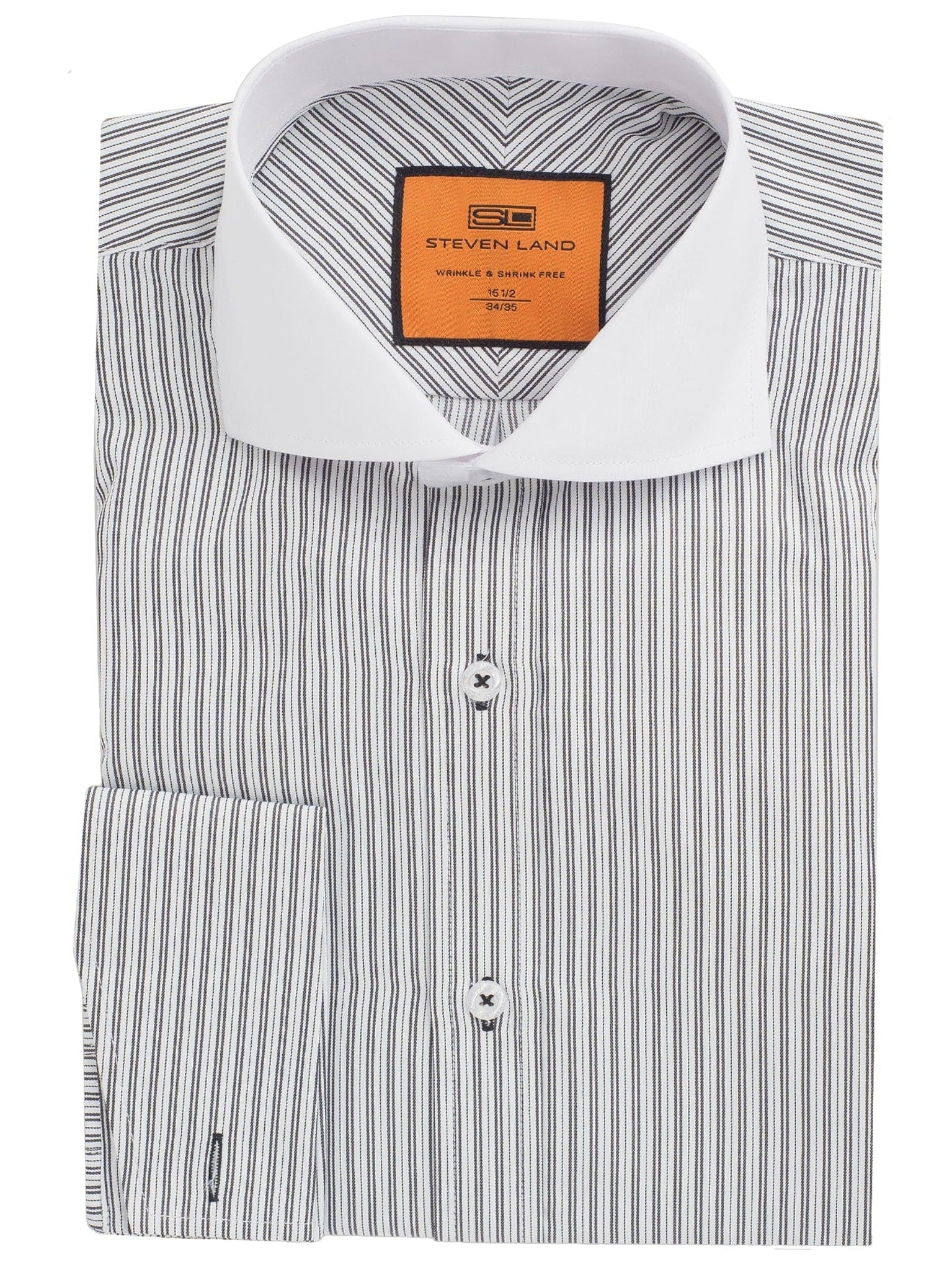 The Steven Land classic fit black striped contrast spread collar shirt is the perfect foundation for suits and blazers, and stands alone with trousers. Its cotton blend is soft and breathable. Enjoy this classic addition to your wardrobe for years to come.