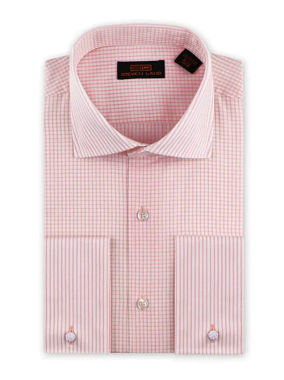 Steven Land Mens Pink Check Classic Fit 100% Cotton French Cuff Cutaway Collar Dress Shirt
