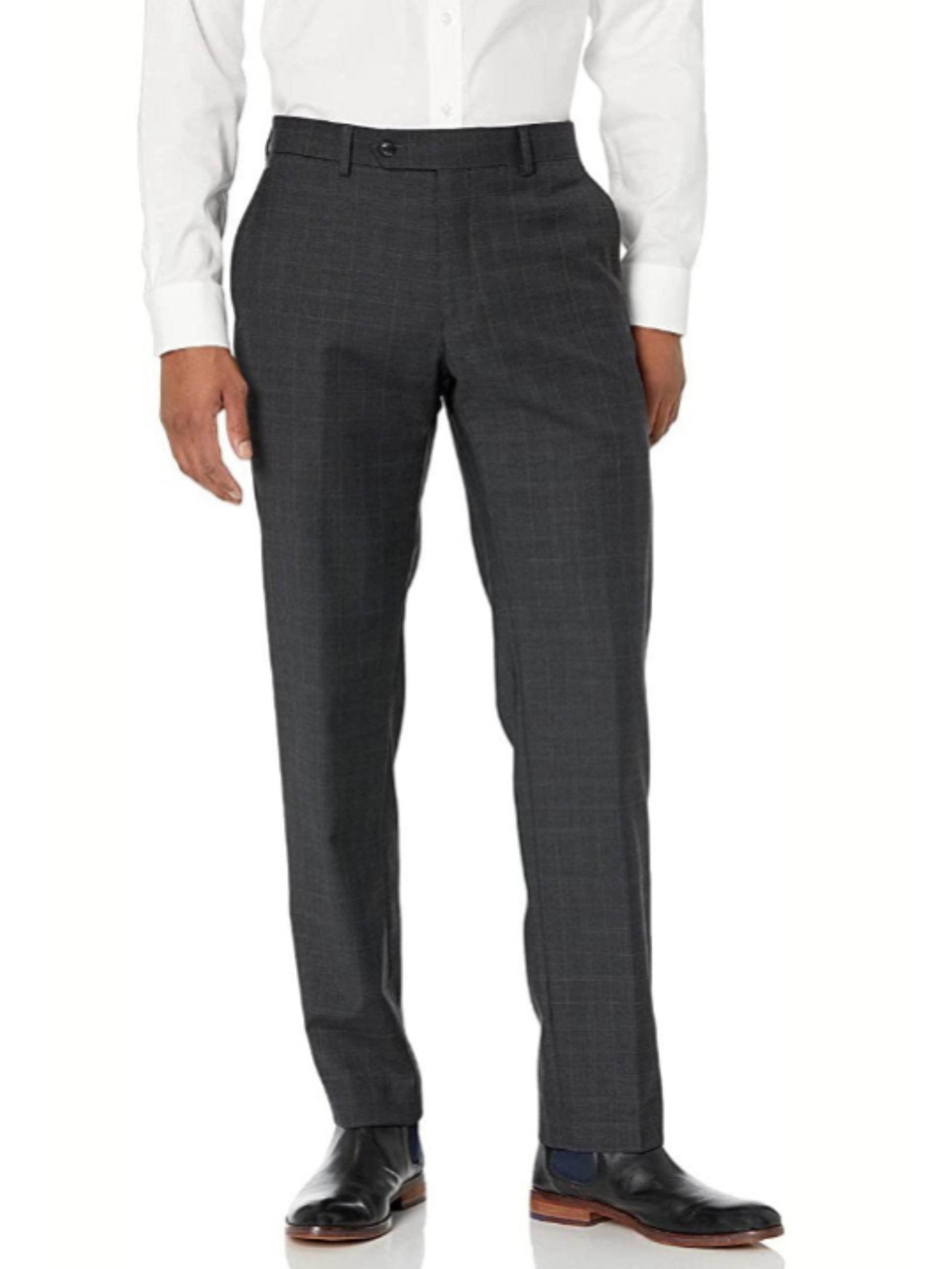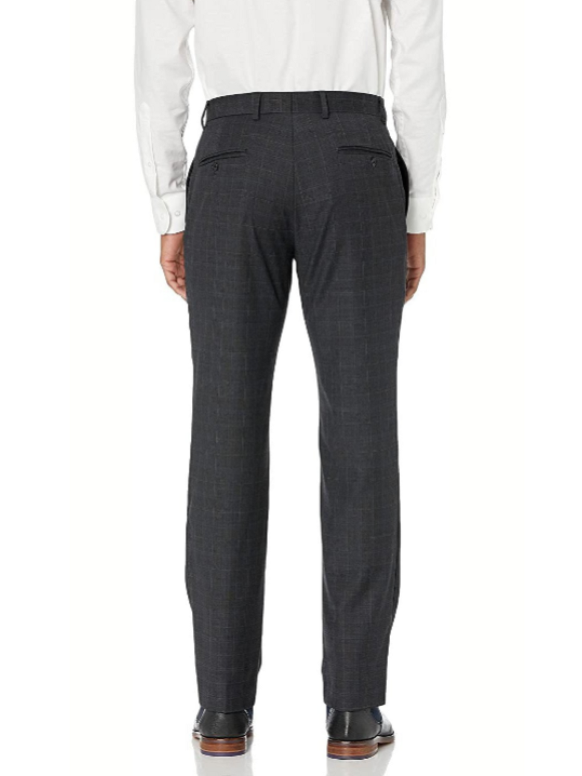This Tommy Hilfiger charcoal grey suit features a subtle light blue windowpane pattern that adds modern flair to a timeless design. Crafted from a comfortable blend of 52% wool, 45% polyester, and 3% spandex, it offers both structure and stretch. The modern fit cut is tailored yet easy to wear, with a classic notch lapel, two-button front, and double vents. Ideal for business, weddings, or any formal occasion.
