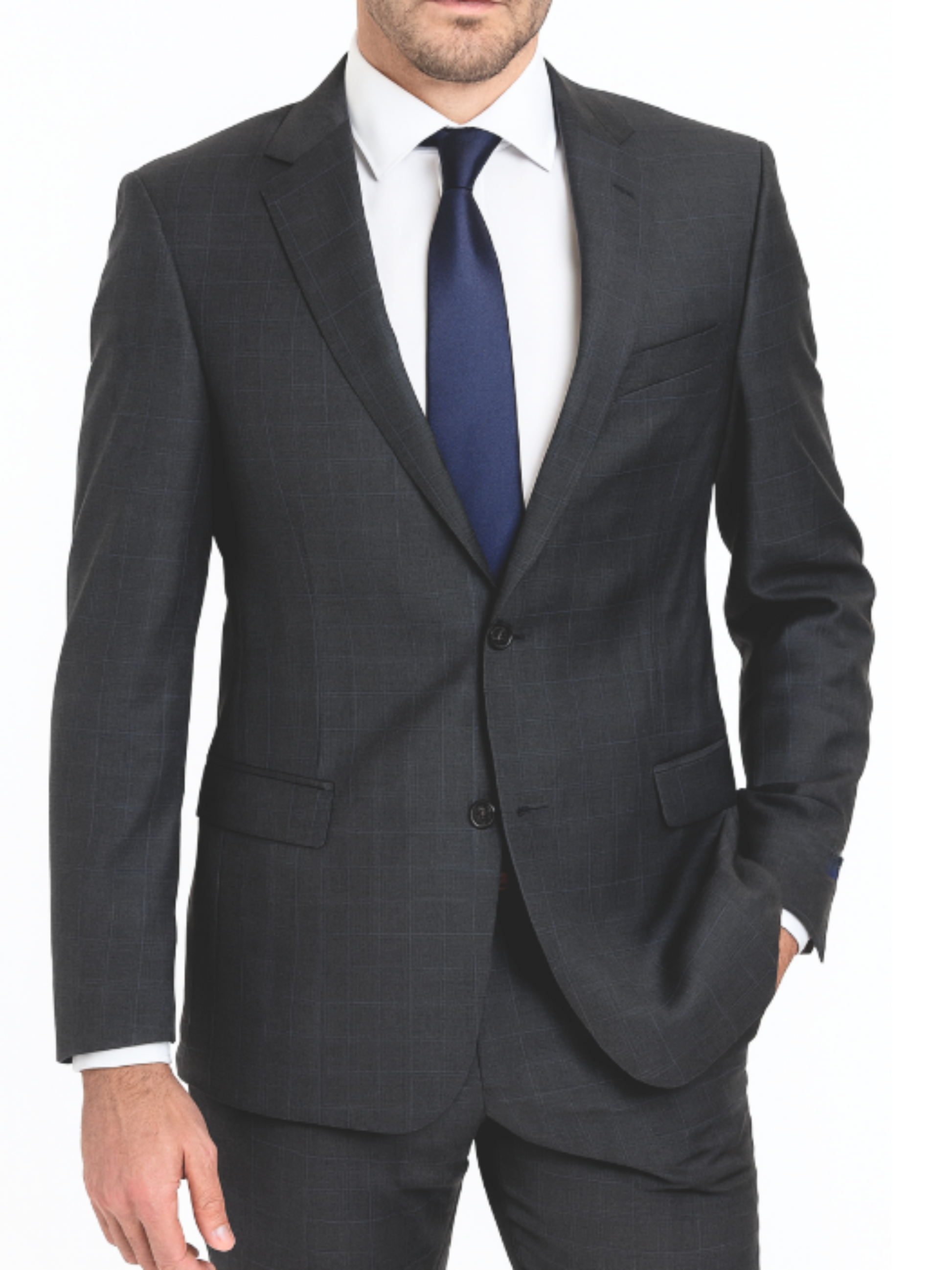 - Includes plain front trousers and a two-button jacket.